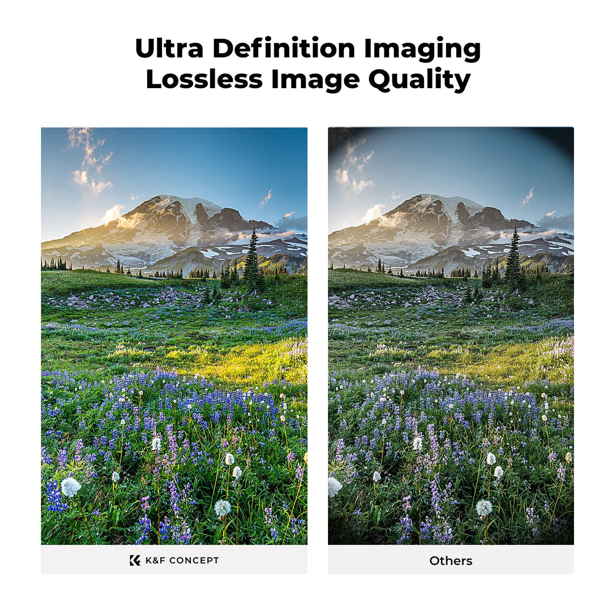 Q: What makes the K&F Concept filter different from others on the market?A: The K&F Concept polarizer filter is crafted from premium AGC optical glass and features 24 multi-layer coatings, including hydrophobic properties. This unique design minimizes reflections and provides true-to-life images while preserving the colors of your photos, setting it apart from standard filters.