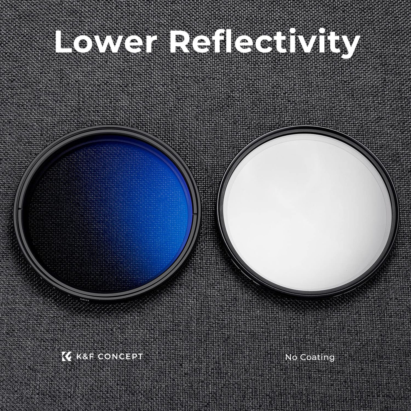 Q: What materials are used in the construction of this ND filter?A: The K&F Concept Variable ND filter is made from imported AGC glass, which features a double-side waterproof multi-layer blue coating for durability and clarity. The frame is ultra-slim at just 7.4mm to minimize vignetting and is crafted from lightweight CNC material for easy installation and removal.