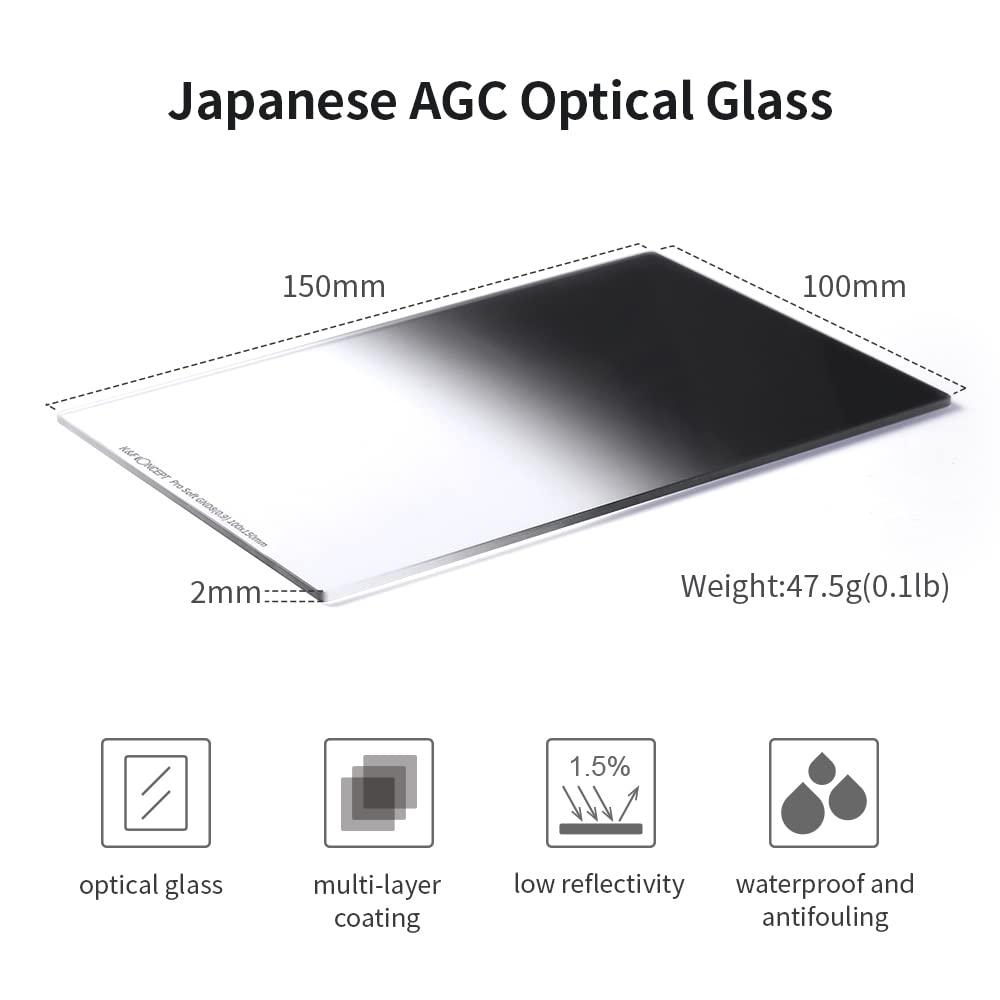 ?Including?The Square Filter Set Includes 1 * Soft Gnd8 Filter +1 * Metal Filter Holder + 8 * Filter Adapter Rings +1 * Filter Carry Bag. | ?Soft Gnd8?Soft Graduated Natural Density Filter Has 3 Stops, Is To Balance The Light Between The Ground And The Sky, Avoid Over-Exposure, 12.5% Transmittance, And Lower 1.5% Reflectivity (Compared With Commonly 0.2% Reflectivity). | ?Metal Filter Holder?The Filter Holder Is Made Of Aviation Aluminum With Cnc Integrated Technology, The Surface Is Black Matte Oxidation The Weight Is 77G, 9Mm Thickness, And Fit Lens Focal Length Larger Than 18Mm Wide-Angle Lens. | ?28 Multi-Layer Coatings?Both Sides Of The Glass With Nanometer Coatings Are Waterproof, And Scratch-Resistant, The Double-Side Polishing Technology Ensures The Light Penetrates The Glass, With No Color Cast. | ?Imported Agc Glass?The Filter Made Of Japanese Agc Glass Ensures A High-Quality Image.