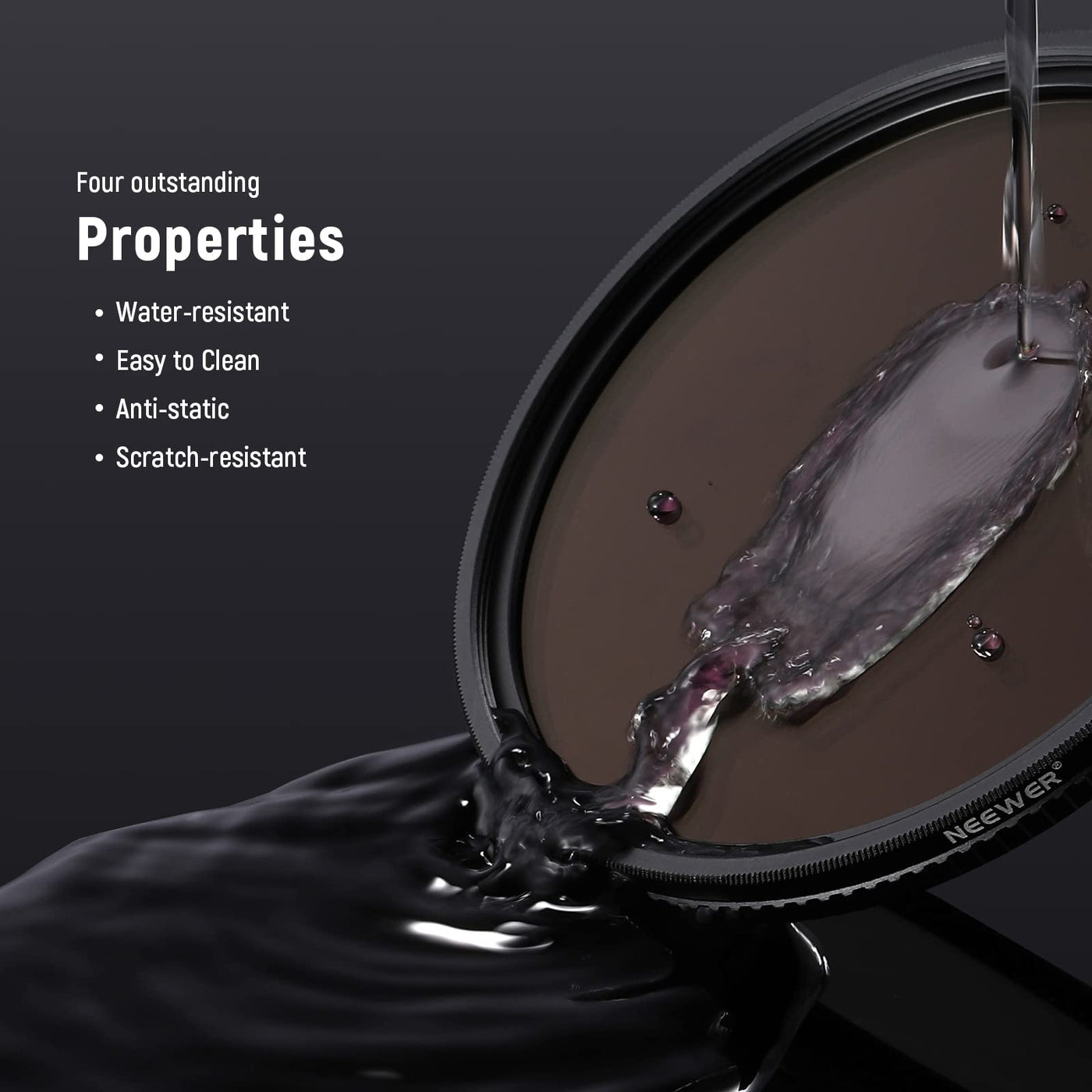 ?Variable Nd Filter? Neewer Variable Nd2-32 Filter Can Reduce The Light Transmission From 1 To 5 Stops, Slow Down The Shutter Speed For A Longer Exposure, And Help You Shoot Moving Subjects With Dynamic Motion Blur Effects On Rainy, Cloudy, Or Sunny Days | ?Multiple Coatings? The Optical Glass Is Protected By Layers Of Coatings For Optimal Performance Under Any Circumstance. Multi-Resistant Coatings Are Water-Repellent, Oleophobic, Scratch-Resistant, And Low-Reflection | ?Slim Metal Frame? Ultra-Slim Aluminum Alloy Frame With An Anti-Glare Black Matte Finish Won