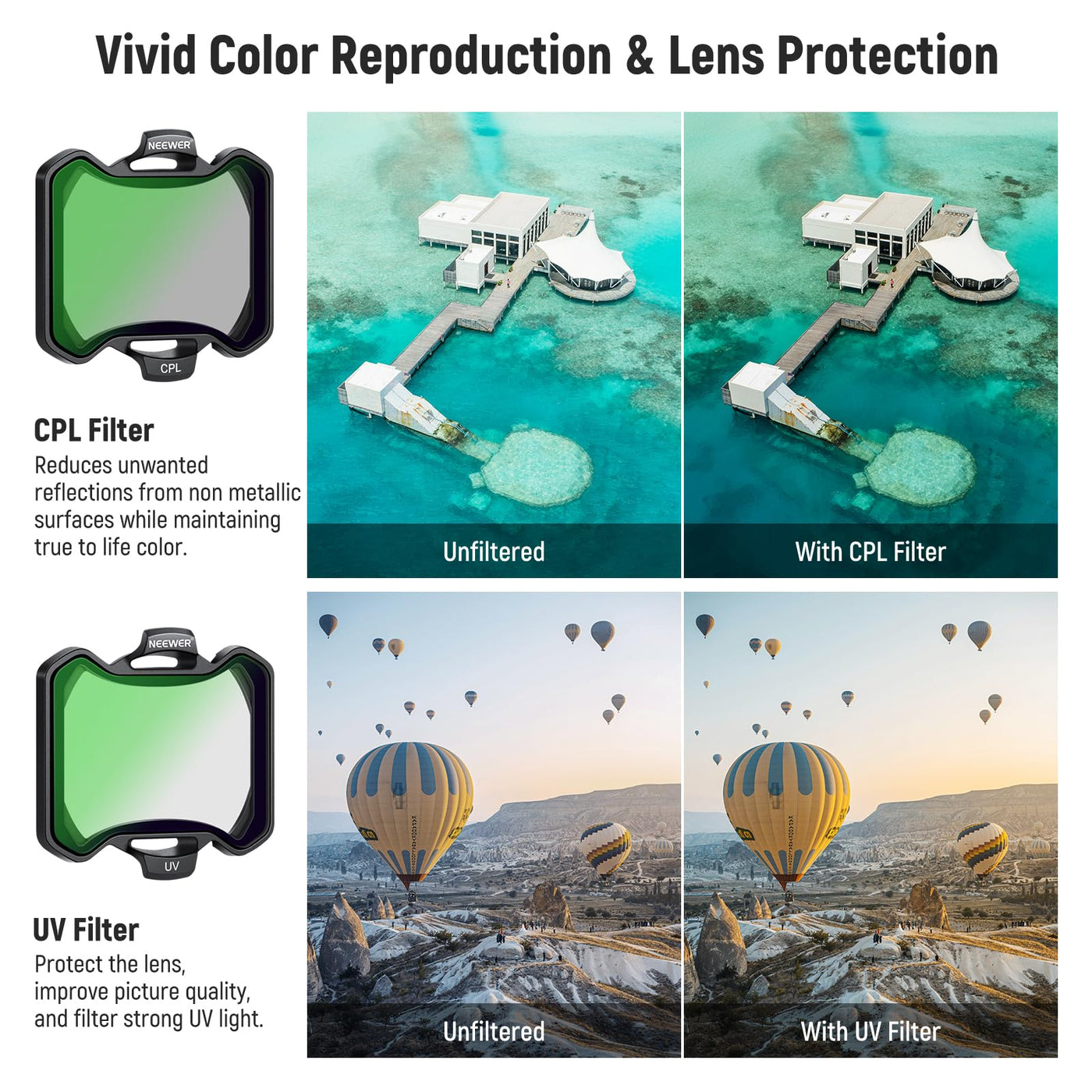 Q: What filters are included in the NEEWER Snap On ND&UV&CPL Filter Set?A: The NEEWER Snap On ND&UV&CPL Filter Set includes ND8, ND16, ND32, ND64 neutral density filters, a circular polarizing (CPL) filter, and a UV filter. This variety allows for precise control over exposure and enhances color accuracy.