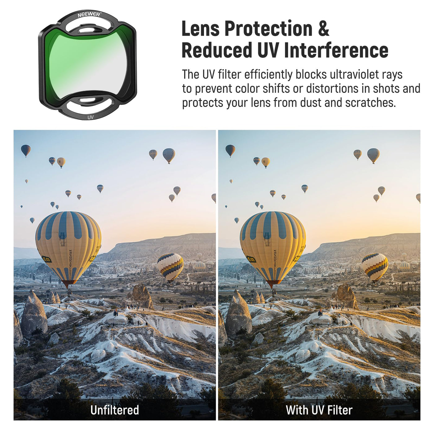 Q: Can the UV filter protect my lens during outdoor shoots?A: Yes, the UV filter not only blocks ultraviolet rays to prevent color distortions in your images but also protects your lens from dust, scratches, and other environmental factors, ensuring clarity and quality in your outdoor photography.