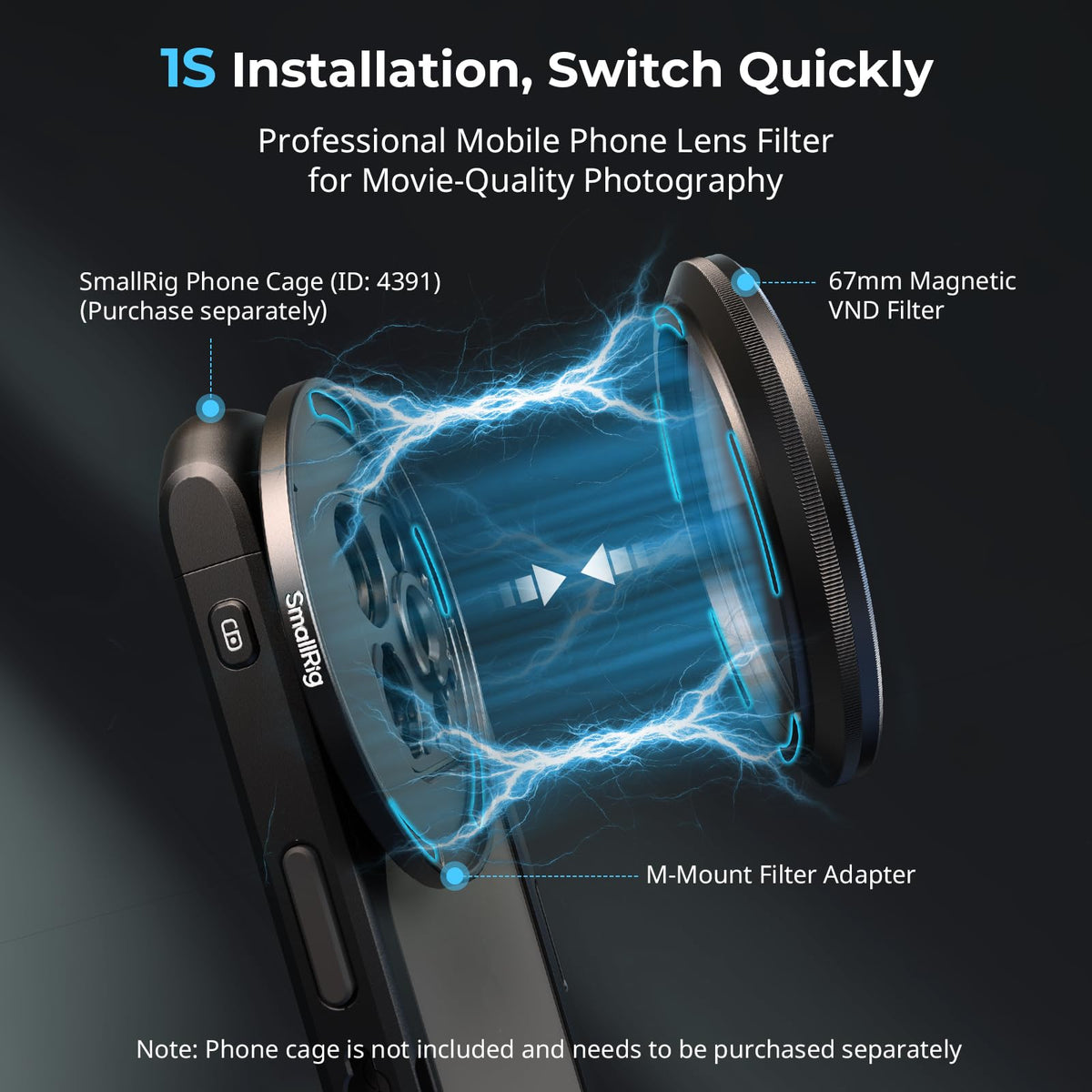 Smallrig Attachable Vnd Filter Kit Nd2-Nd32 (1-5 Stop) With M-Mount Filter Adapter 67Mm 4724 Key Features: 1.The Vnd Filter Provides 5 Levels Of Adjustable Light Reduction Effects, Offering Optimal Exposure Settings For Video Shooting And Creating Dynamic Blurred Images. 2.German Multi-Coated Optical Glass, Ensuring High Definition And High Transparency. 3.No Vignetting On The Image. 4.Rotating Stop Design To Prevent Filter Deviation During Adjustment. 5.Seamless Transition Between The Stops With Defined Endpoints 6.Featuring A Magnetic Attachment System, It Allows For Quick Installation And Filter Swapping. 7.Includes An M-Mount Adapter Ring For Direct Integration With M-Mount Backplane For Iphone Series Cages. 8.Comes With A Threaded Adapter Ring, Also Suitable For Use With 67Mm Camera Lenses. Smallrig Attachable Vnd Filter Kit Nd2-Nd32 (1-5 Stop) With M-Mount Filter Adapter 67Mm 4724 Through The Vnd Filter With Adjustable Exposure Reduction, Users Can Flexibly Utilize It In Video Shooting, Providing Them With Reasonable Exposure Parameter Settings And Delivering More Professional Video Footage. The Multi-Coated Optical Glass Offers Reliable Optical Quality, Ensuring That The Captured Images Are Free From Vignetting. The Magnetic Attachment System Provides Users With A Fast And Efficient Experience For Installing And Replacing Filters. The Set Includes An M-Mount Adapter Ring For Direct Integration With M-Mount Backplane For Iphone Series Cages. Equipped With The Threaded Adapter Ring, The Filter Can Be Mounted On A 67Mm Camera Lens, Providing A Convenient Magnetic Filter Installation Experience For Camera Lenses. Note: While The Filter Design Significantly Reduces The Occurrence Of Vignetting In Photos, It Does Not Guarantee The Complete Elimination Of Vignetting Under All Shooting Conditions And Camera Settings. Compatibility: For Iphone Series: 4407, 4473, 4391, 4392, 4393, 4396, 4397, 4398 Package: Vnd Filter Nd2-Nd32 X 1 M-Mount Filter Adapter X 1 Threaded Adapter Ring X 1 Cleaning Cloth X 1 Carrying Box X 1 User Manual X 1 Product Dimensions: Vnd Filter: F77Mm /F3.0In , 9Mm / 0.4In Thick M-Mount Filter Adapter: F70Mm /F2.8In, 6Mm / 0.2In Thick Product Weight: Vnd Filter: 41 5G / 1.5 0.2Oz M-Mount Filter Adapter: 14G 5G / 0.5 0.2Oz Package Dimensions: 105X97X32Mm/ 4.1X3.8X1.3Inv Package Weight: 110G 10G/ 3.9 0.4Oz Material(S): Glass, Aluminum Alloy