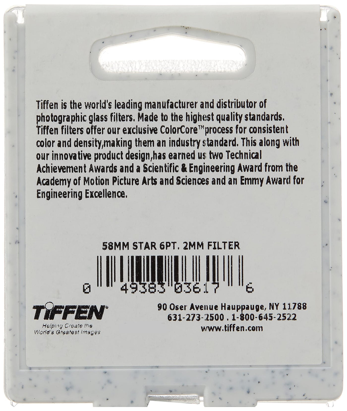 The 58Mm 6Pt/2Mm Star Filter From Tiffen Creates Multiple Points Of Light, Or ''Stars,'' Streaking Outward From A Central Light Source. This Filter Comes In A Rotating Mount For Critical Placement Of The Star Effect.Wedding Photographers Will Especially Appreciate The Value Of This Filter. When It Comes To Special Effects Shots, Why Not Offer Your Client A Table Shot Of The Menu Or Invitation Next To A Glowing, Star-Filled Candle? Shooting At Night? Any Point Light Source Will Achieve The Effect. Tiffen'S Colorcore Glass Is Produced Through A Process That Entails Permanently Laminating The Filter Material In Between Two Pieces Of Optical Glass That Are Ground Flat To Tolerances Of A Ten-Thousandth Of An Inch, Then Mounting Them In Precision Aluminum Rings.The Effect Is Produced By A Series Of Thin Lines Etched Into The Flat Optical Surface Of A Clear Filter You Have Additional Control Through The Choice Of A Particular Spacing Between The Lines On The Filter These Spacing'S Are Measured In Millimeter'S And Range From 1Mm To 4Mm: A 1Mm Spacing Has Twice As Many Lines As A 2Mm Spacing And Will Produce A Brighter Star For Any Given Source. Lines In One Direction Produce A Two-Pointed Star, Just A Streak Through The Center Of The Light.Tiffen Offers 4, 6, And 8 Point Symmetrical Star Effects As Well As Additional Asymmetrical Star Patterns Through Their Exclusive Hollywood Fx Series (North, Hyper, Vector And Hollywood Star Effects)Tiffen'S Colorcore Glass Is Sealed Between Two Optical Glass Sheets. In This Way, Tiffen Can Better Control The Various Densities Of Their Filters And Thereby Create More Exact Degrees Of Filtration. This Process Makes For Greater Accuracy Of Color As Opposed To Glass That Is Simply Dyed And Become Subject To Deviation During The Dye Process. Tiffen, A Leader In The Filter Industry. /P>