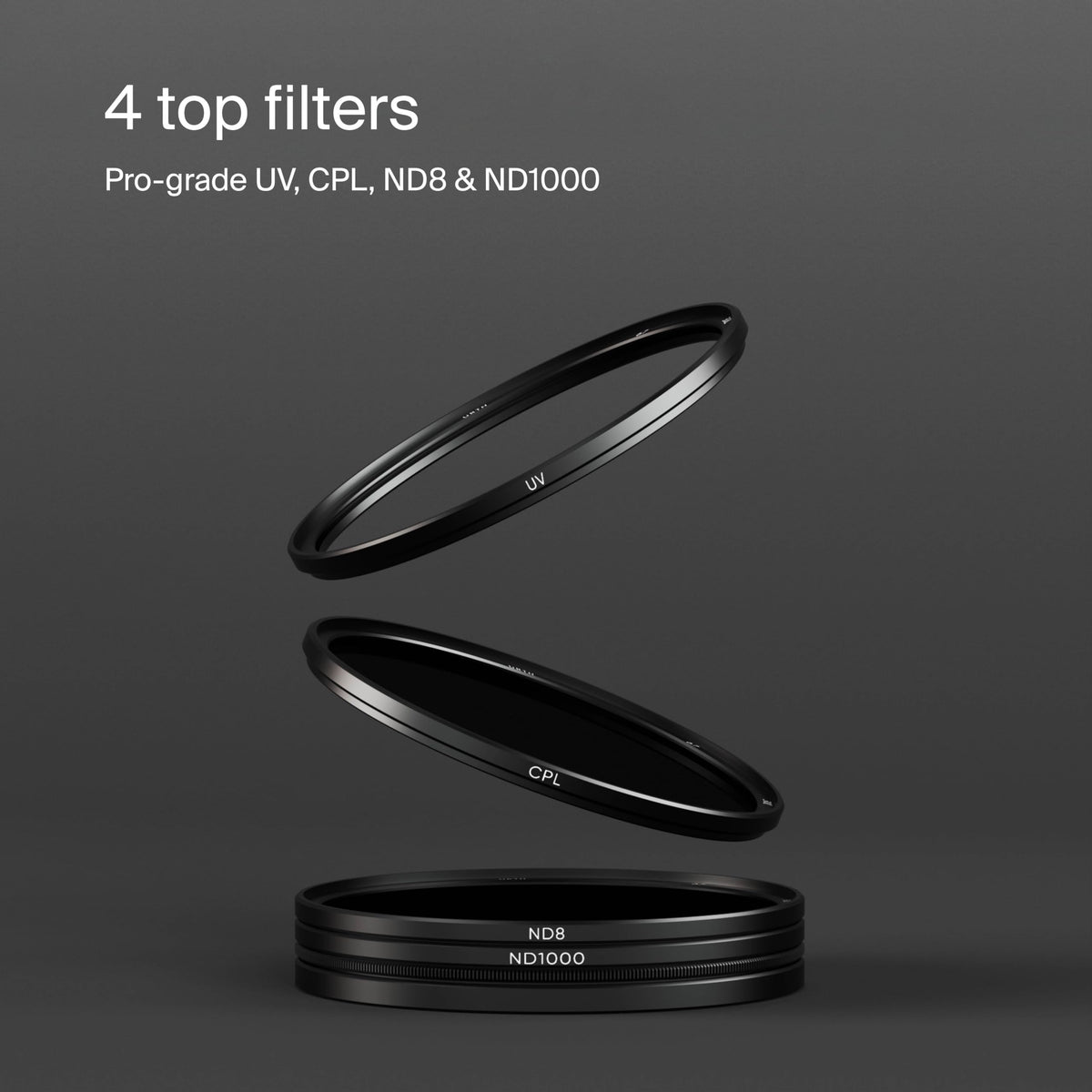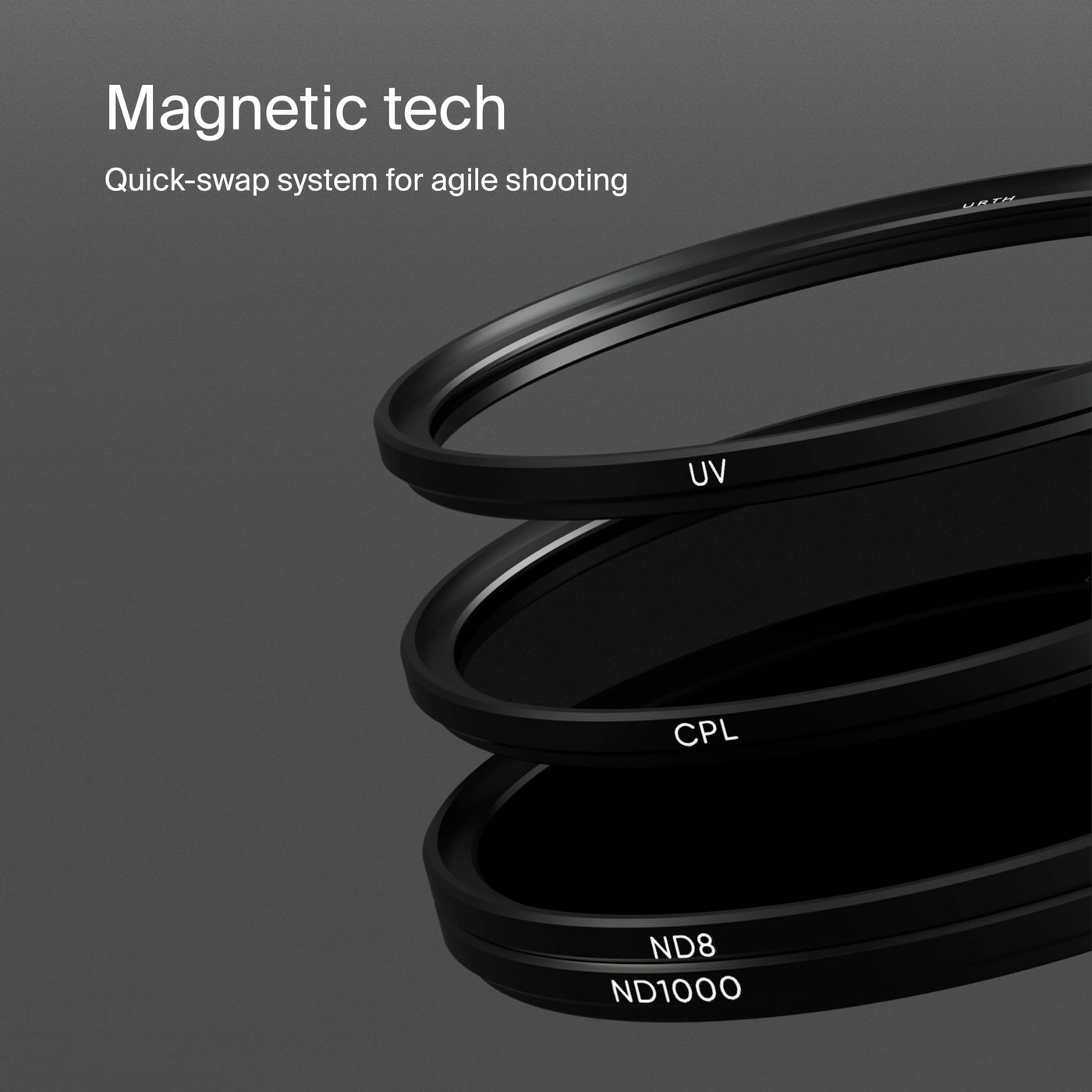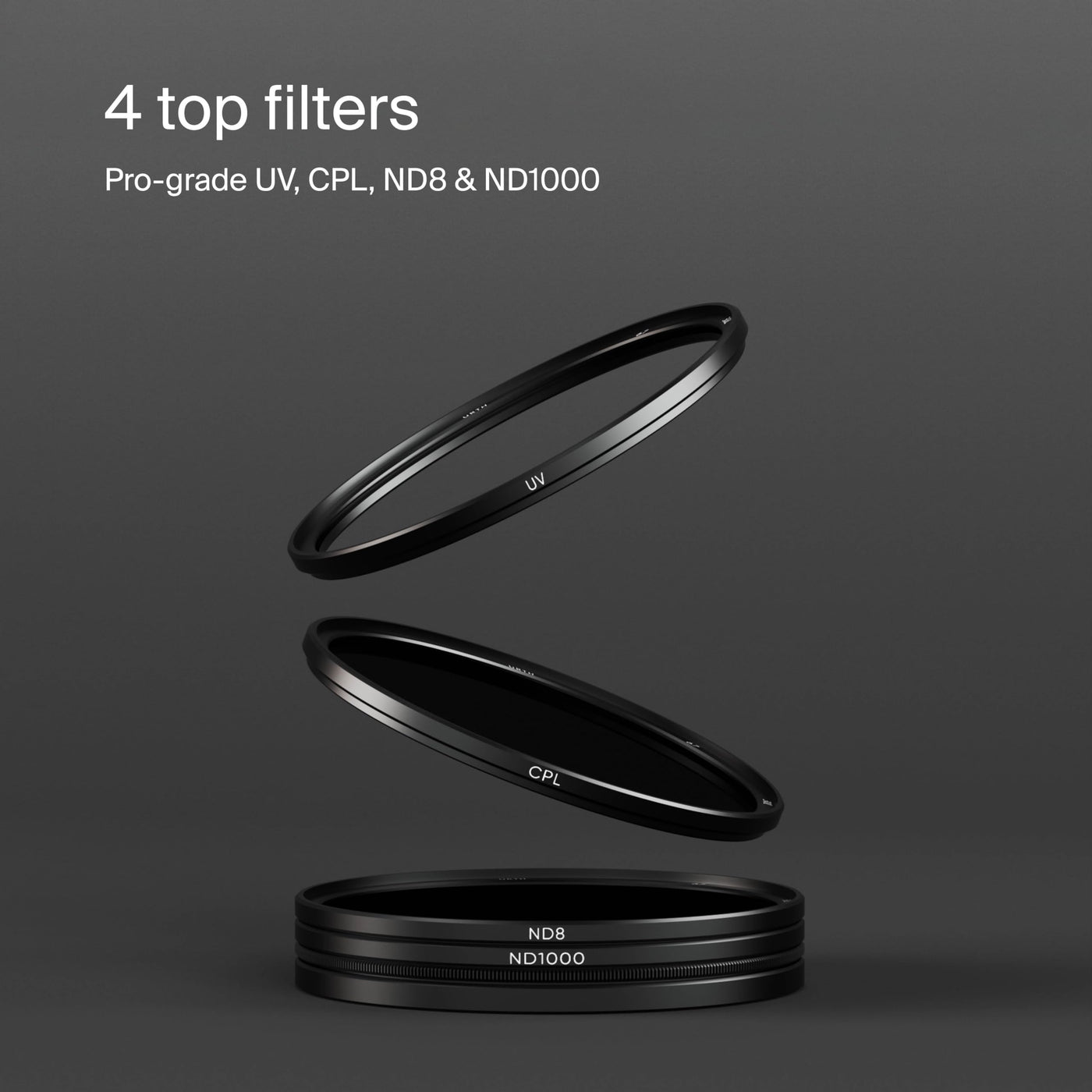 4-In-1 Filter Kit | Features The Magnetic Nd8, Nd1000, Cpl And Uv (Plus+) Filters For More Creative Possibilities And Ease When Exploring Outdoor Photography. | Creative Options | Use The Uv Filter Plus+ To Increase Clarity, Cpl Filter Plus+ To Remove Reflections And Increase Contrast, The Nd8 Filter Plus+ & Nd1000 Filter Plus + To Slow Shutters And Widen Apertures. | Magnetic Engineering | The Magnetic Design Minimises Space And Weight In Your Kit And Speeds Up Workflow. The Ultra-Slim Rim Is Designed For Optimal Optics, Eliminating Vignetting. Please Note: Magnetic Filters Include A Magnetic Adapter Ring. | Pro Glass | Urth Pro-Range Magnetic Filter Kits Feature 20-Layer Nano-Coated German Schott Glass, Ensuring Exceptional Light Control And Transmission. | Lifetime Quality | Made From Tough Magnalium, Urth Magnetic Lens Filters Offer Lasting Resilience. Backed For Life.