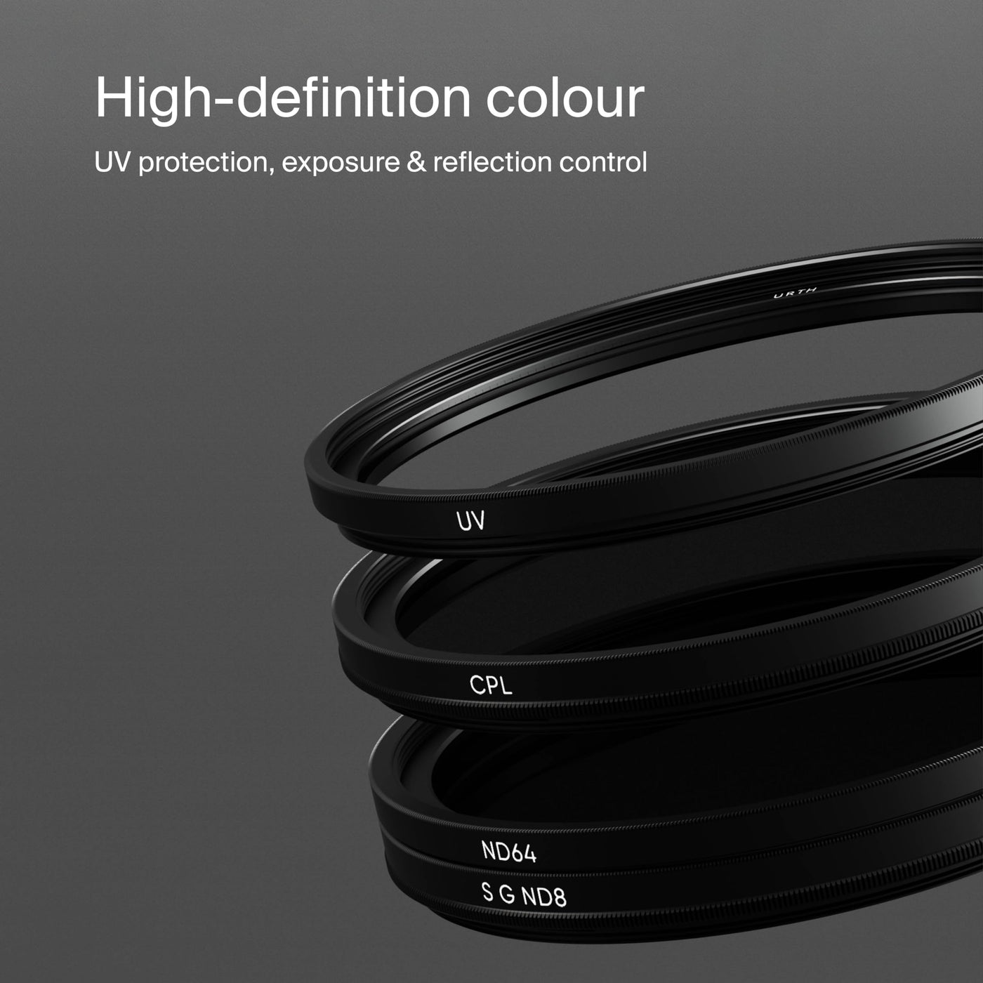 Our Uv Filter Plus+ Cuts Ultraviolet Light, Sharpens Your Photos, And Protects Your Lens Against Scratches, Water, Dirt, And Fingerprints. Our Cpl Polarizing Filter Plus+ Cuts Reflected (Polarized) Light, Which Increases Contrast And Boosts Colour Saturation And Vibrancy.Our Nd64 Filter Plus+ Blocks A Fixed 6 F-Stops Of Light Allowing Longer Shutter Speeds For Long Exposure, And Wider Apertures For Depth Of Field Effects. Our Soft Grad Nd8 Plus+ Provides A Fixed 3 F-Stop Light Reduction For Balanced Exposure And Better Dynamic Range In Graduated Light Conditions Like You Find In Mountains, Forests And Sunsets.