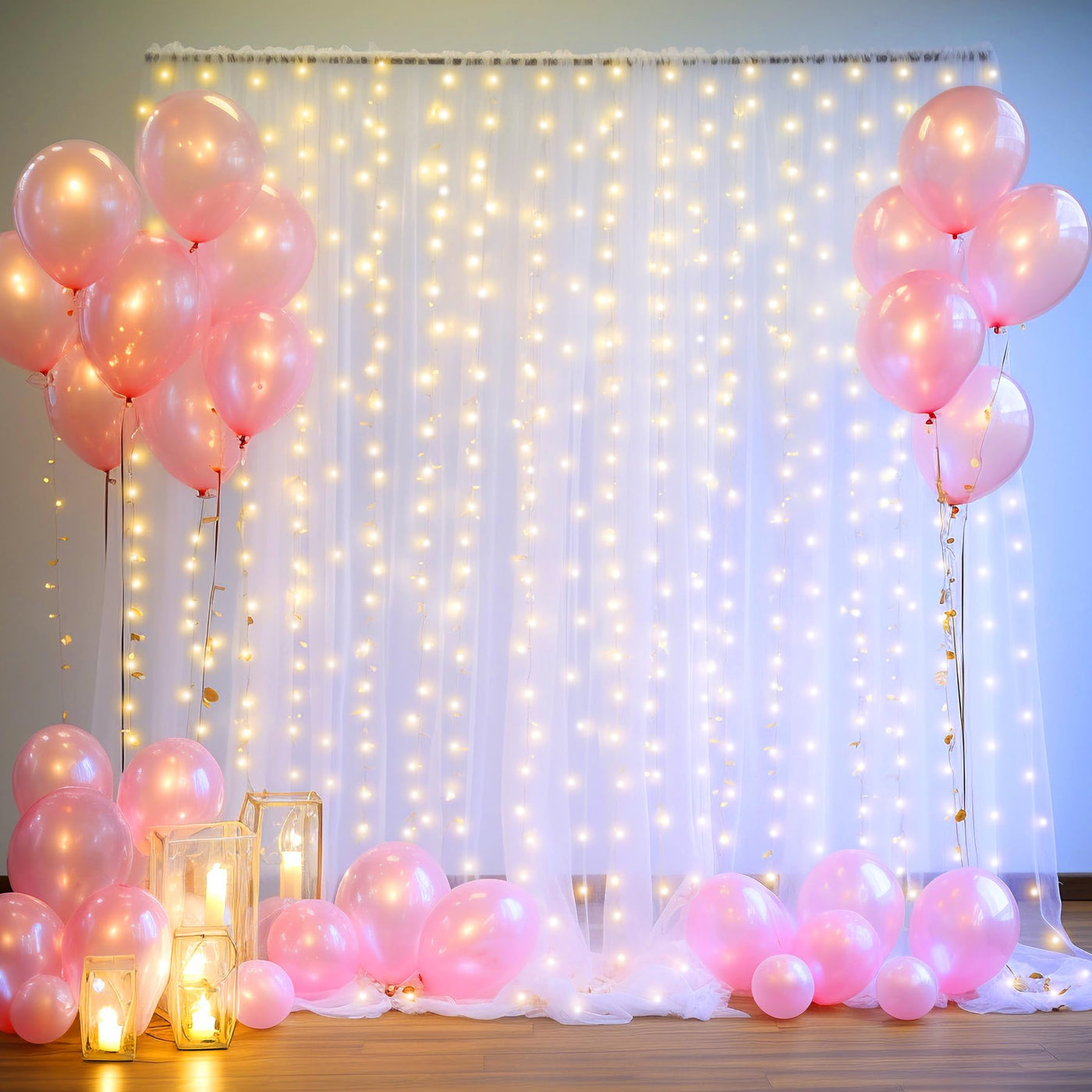 10Ft X 10Ft White Sheer Tulle Backdrop Curtains With Lights String For Party Wedding Wrinkle Free Curtain Backdrops Drapes For B