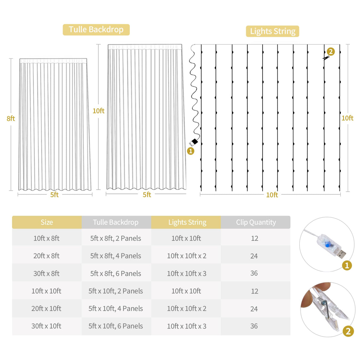 - Q: What are the dimensions of the white sheer tulle backdrop curtains? A: The backdrop includes two panels, each measuring 5ft in width and 10ft in height, resulting in a total size of 10ft x 10ft.