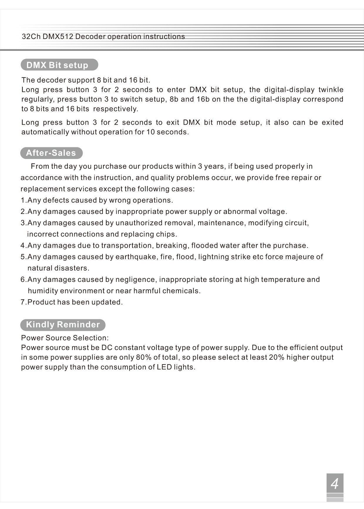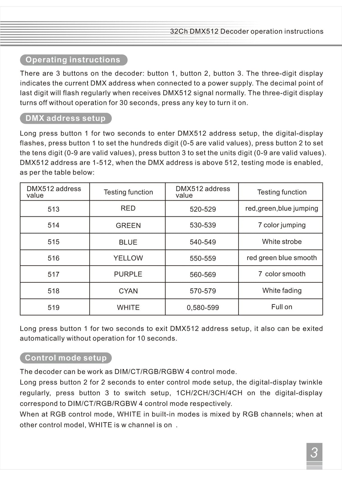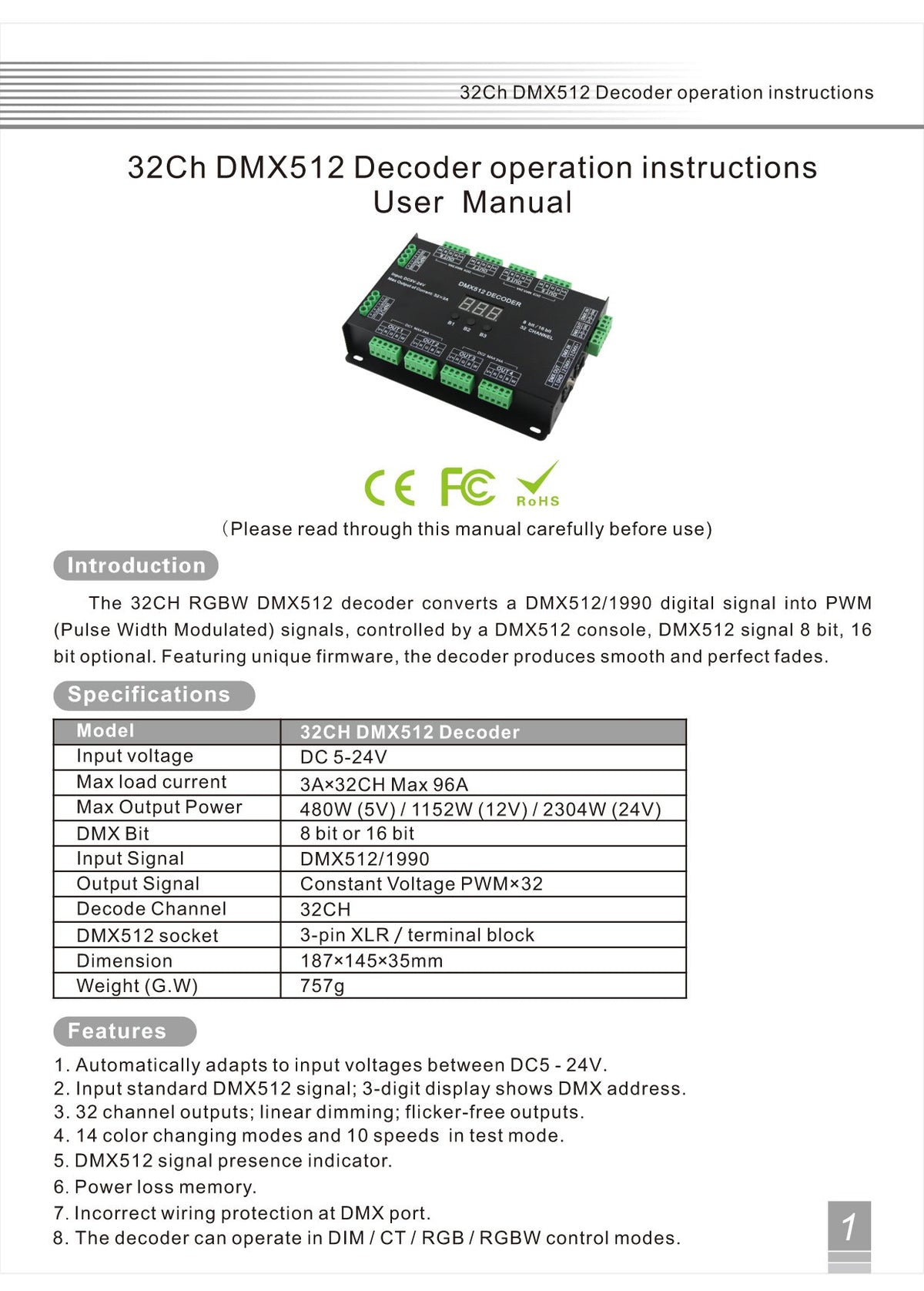 Descriptionthe 32Ch Rgbw Dmx512 Decoder Converts A Dmx5121990 Digital Signal Into Pwm (Pulse Width Modulated) Signals, Controlled By A Dmx512 Console, Dmx512 Signal 8 Bit, 16 Bit Optional Featuring Unique Firmware, The Decoder Produces Smooth And Perfect Fadesspecifications:Model: 32Ch Dmx512 Decoderinput Voltage: Dc 5-24Vmax Load Current: 3Aa32Ch Max 96Amax Output Power: 480W (5V) 1152W (12V) 2304W (24V)Grey Scale: 8 Bit Or 16 Bit Levelsinput Signal: Dmx5121990Output Signal: Constant Voltage Pwma32Decoder Channel: 32Ch Rgbwdmx512 Socket: 3-Pin Xlr Terminal Blockdimension: 187A145A35Mmweight (Gw): 757Gfeatures:1 Automatically Adapts To Input Voltages Between Dc5 - 24V2 Input Standard Dmx512 Signal 3-Digit Display Shows Dmx Address3 32 Channel Outputs Linear Dimming Flicker-Free Outputs4 14 Color Changing Modes And 10 Speeds In Test Mode5 Dmx512 Signal Presence Indicator6 Power Loss Memory7 Incorrect Wiring Protection At Dmx Port8 The Decoder Can Operate In Dim Ct Rgb Rgbw Control Modes