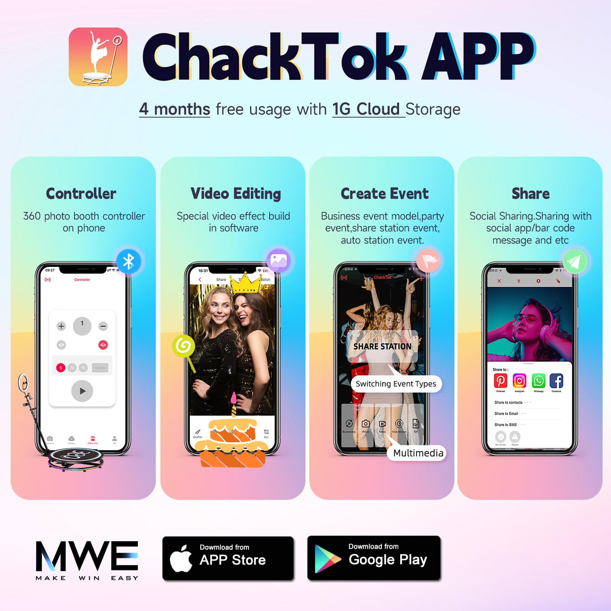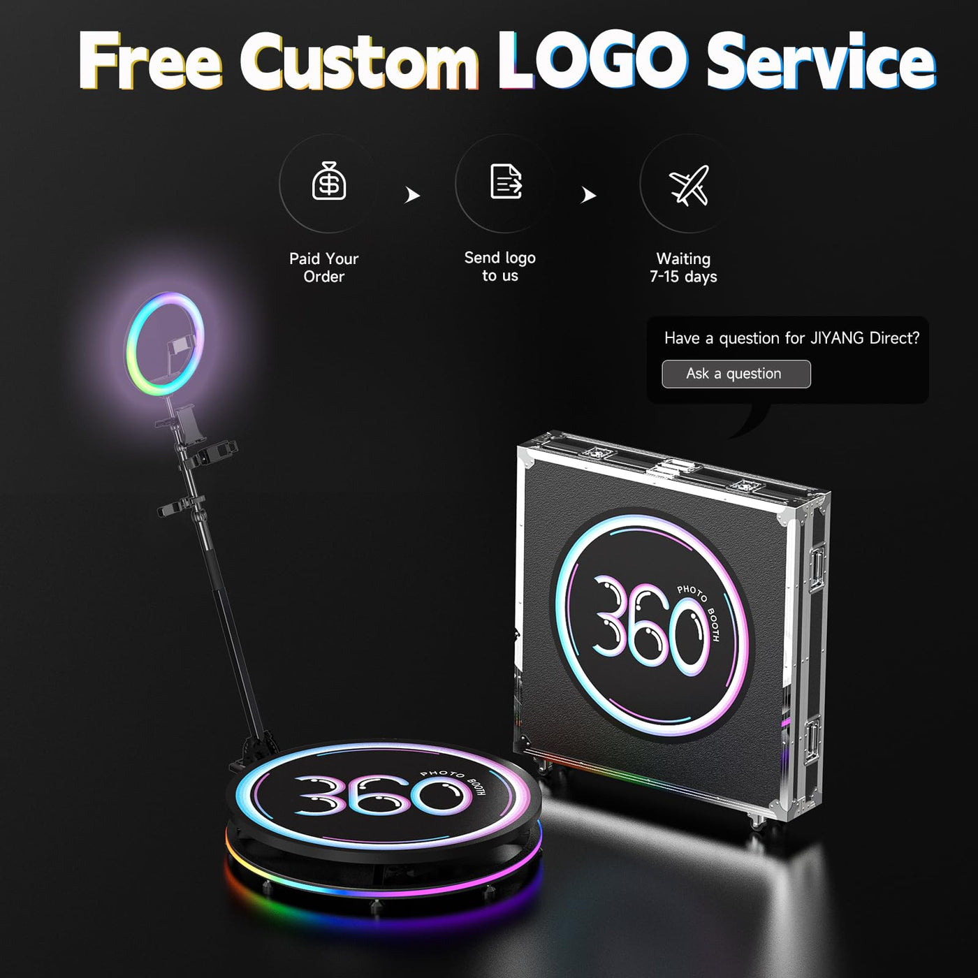 360 Photo Booth Machine With Chacktok App: Chacktok Is A Real-Time Media Artworks Creation And Processing Software For 360 Photo Booth Machine. You Can Use Chacktok To Shoot Some Special-Effect Preprocessed Videos, Gifs, Photos And Edit Them With Special-Effect After. Chacktok Can Connect 360 Photo Booth With Bluetooth. Control The 360 Photo Booth From Your Phone Or Pad While Creating Your Media Artworks. | 360 Photo Booth Automatic Spin: Through The Button/App (Chacktok), You Can Wireless Control The Jiyang 360 Photo Booth Machine By Clockwise Or Counterclockwise. Adjust The Length Of The Selfie Stick From 16Inch To 63Inch, And The Angle From 36 Degree To 156 Degree, And Capture Slow-Motion Video Or Photo From Every Angle. | 360 Photo Booth Machine For Parties: Jiyang 360 Photo Booth Equiped With Selfie Ring Light. 3 Colors Lighting Mode, And Each Lighting Mode Have 10 Adjustable Brightness To Choose. You Can Use 360 Photo Booth Machine To Make 360-Degree Panoramic Spin Videos And Fantastic Photos, And Share Them To Your Social Media Account Instantly Such As Facebook, Instagram, Youtube,Twitter, And Tiktok Etc. Note: Please Prepare A Power-Bank (Not Included) For The Ring Light. | Support Multi-Device: Jiyang 360 Photo Booth Machine Comes With 4 Selfie Holders. It Supports Multi-Device, Such As Different Size Smartphone, Ipad, Go Pro, And Camera. Its A Perfet Choice For Home Parties, Large Events, Weddings, Christmas Shows, And Exhibitions. Peopel Stand On The 360 Spin Camera Booth, It Can Record Every Happiness And Joyful Moments From 360-Degree And Make The Parties Full Of Joy And Happiness, More Attractive And Impression. | Photo 360 Booth For People To Stand On: Jiyang Spinning Camera 360 Booth Has A Three Of Sizes To Choose For Multi People To Use, Such As 80Cm/31.5Inch For 2-3 People Max 440Lbs To Use;100Cm/39.4Inch For 3-5 People Max 880Lbs To Use;110Cm/45.2Inch For 5-7 People Max 1300Lbs To Use. There Are Two Different Package Options As Honey Comb Carton Box And Flight Case Package.