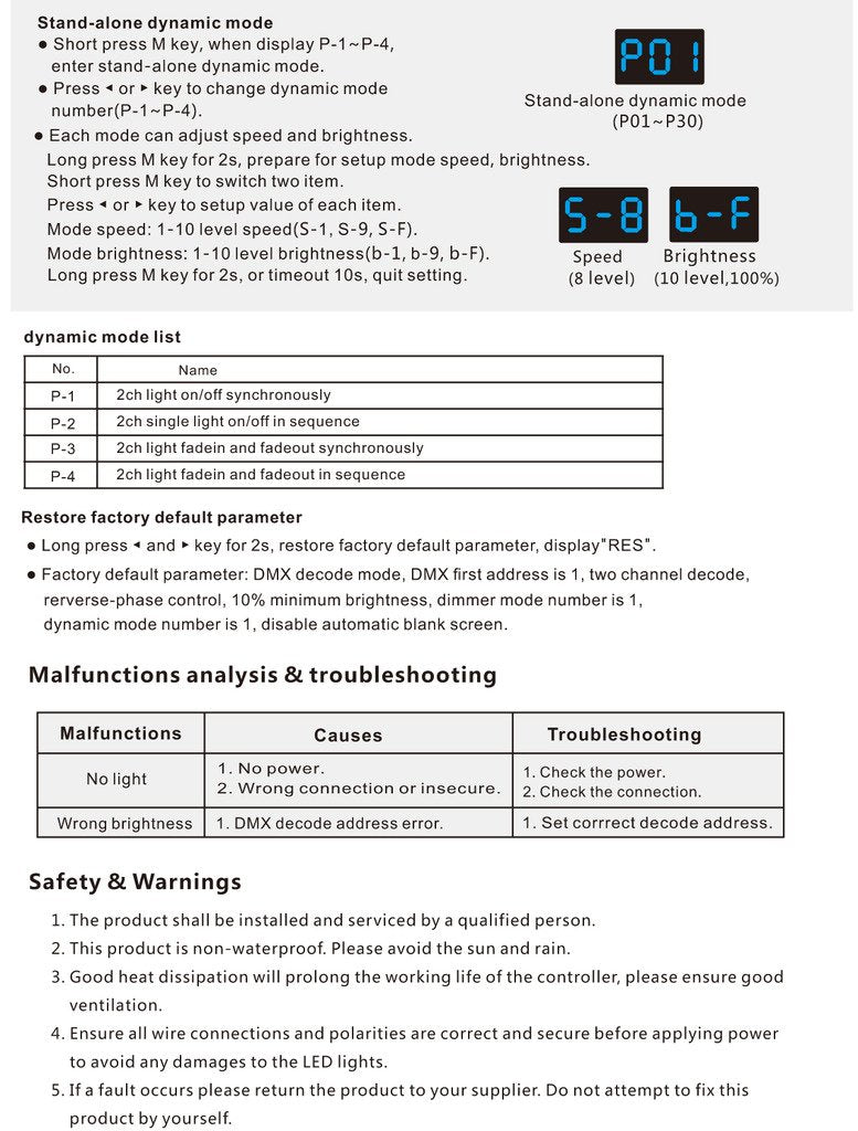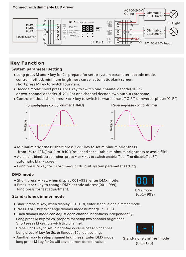 Technical Parameters Input Voltage: 100-240Vac Output Voltage: 2 X 100-240Vac Output Current: 2 X 1.2A Output Power: 100-288W Decode Number: 1/2 Dmx Channel Dimming Range: 0-100% Working Temperature: -30?55? Dimension: L170 W50 H23Mm Weight: Weight: 130G Summary Ac Triac Dmx512 Dimmer, Two Channel Output. With Standard Dmx512 Compliant Interface, Dmx Address Can Be Set Easily And Shown On The Digital Numeric Display. It Can Also Work As Stand-Alone 2 Channel Dimmer, Each Channel Adjust Brightness Independently, And Save Up To 8 Groups Brightness. Triac Dimmable And Mosfet Dimmable. Leading Edge Dimming Or Trailing Edge Dimming Set By Key. Minimum Brightness Set By Key. To Dim And Switch Single Color Dimmable Led Lamps,Traditional Incandescent And Halogen Lights.