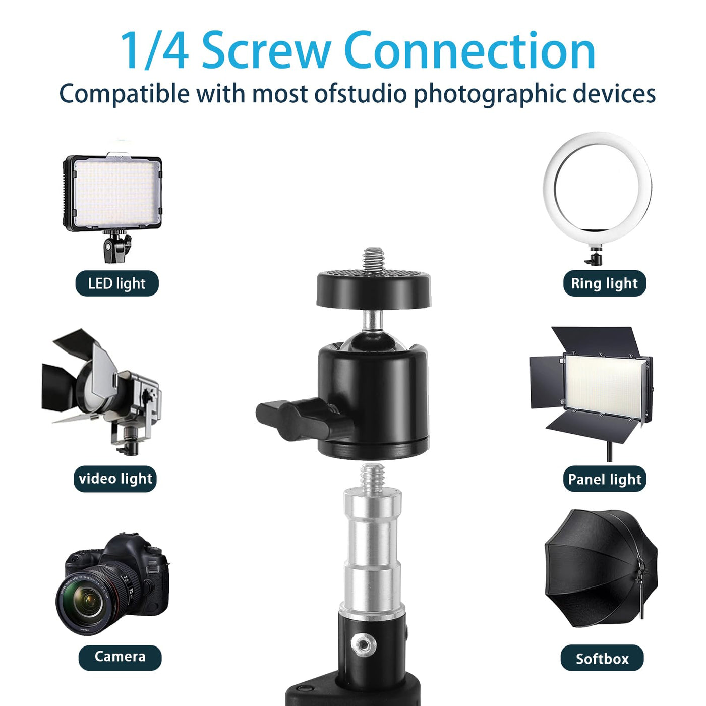 Q: Is the tripod stand compatible with different types of cameras and lighting equipment?A: Yes, this tripod stand features a 1/4 screw that is compatible with most cameras, speedlights, strobe lights, softboxes, and umbrellas, allowing for versatile use in different shooting scenarios.