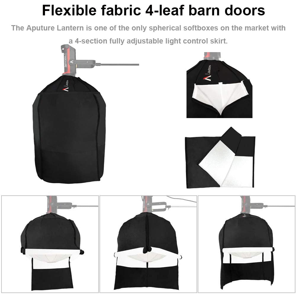 Aputure Lantern Softbox - Light Up The Room Aputures Chip-Oboard Leds Shine Because Of Their Versatility, And Ability To Create Hard Or Soft Light Simply By Using Different Lighting Modifiers. With The Recent Release Of The Fresnel 2X And The Spotlight Mount, For Intensifying And Shaping Hard Light, We Decided It Was Time To Introduce An Easier Way To Shape Your Soft Light Too. Ideal For Use Overhead Or To Raise The Ambient Illumination Level, The 26 Diameter Lantern Softbox From Aputure Has The Same Omni-Directional Quality Of Light As The China Balls Of Yore But Is Built Of Durable Materials And Has Accessories Such As A Skirt Set To Control The 270-Degree Beam Spread. The Lantern Has A Bowens Mount That Fits Aputure Lights Such As The 120D Or 300D Series, But It Is Also Compatible With Many Other Lights That Use This Popular Mount. 26 Diameter, Bowens Mount Absorbs 1 Stop, 270&Deg; Beam Spread Comes W/ Skirts To Control Light Radius Use On Led Or Strobe Lights Aputure Lantern Soft Light Modifier Specification: Product Unfold Dimension: 650*650*560Mm/25.5*25.5*22 Inches. Product Collapsed Dimension: 180*180*810Mm/7*7*32 Inches Box Dimension: : 185*185*838Mm/7.3*7.3*32.9 Inches Removable Front Face: No Removable Interior Baffle: No Material: Fabric Weight: 2.76Kg/6.09Lbs Diffusion Stops: 1-Stop What Is In The Package? 1X Aputure Lantern Spring Cage 1X Diffusion 1X Fabrick Barn Doors 1X Carriage Bag