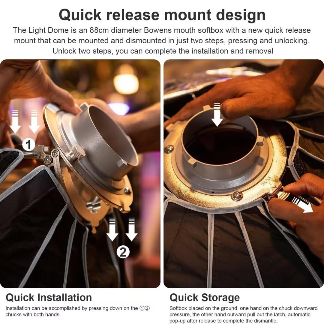 Q: What is the quick-folding design of the Aputure Light Dome III and how does it benefit users?A: The quick-folding design of the Aputure Light Dome III allows for rapid setup and breakdown, enabling users to save valuable time on set. This innovative feature lets you snap the softbox into its full compact circular shape in seconds, making it one of the fastest softboxes available on the market.