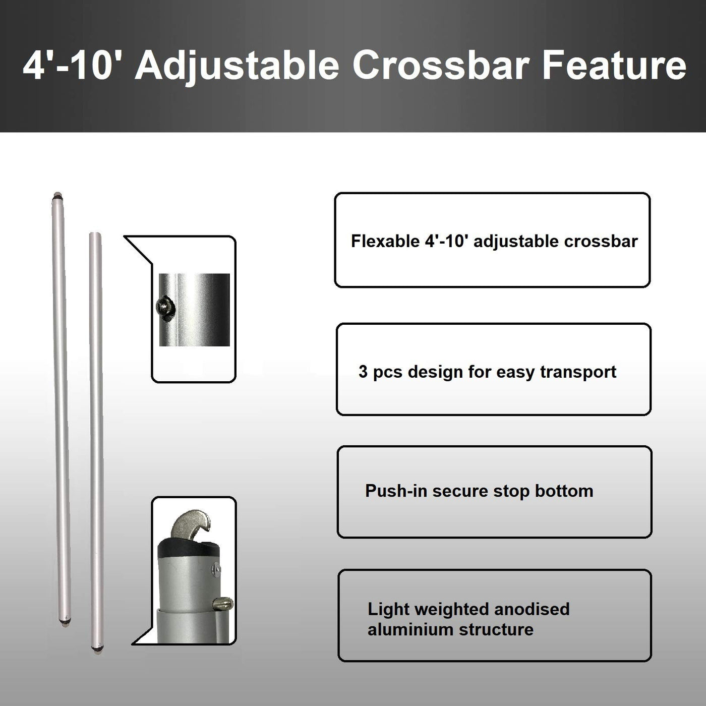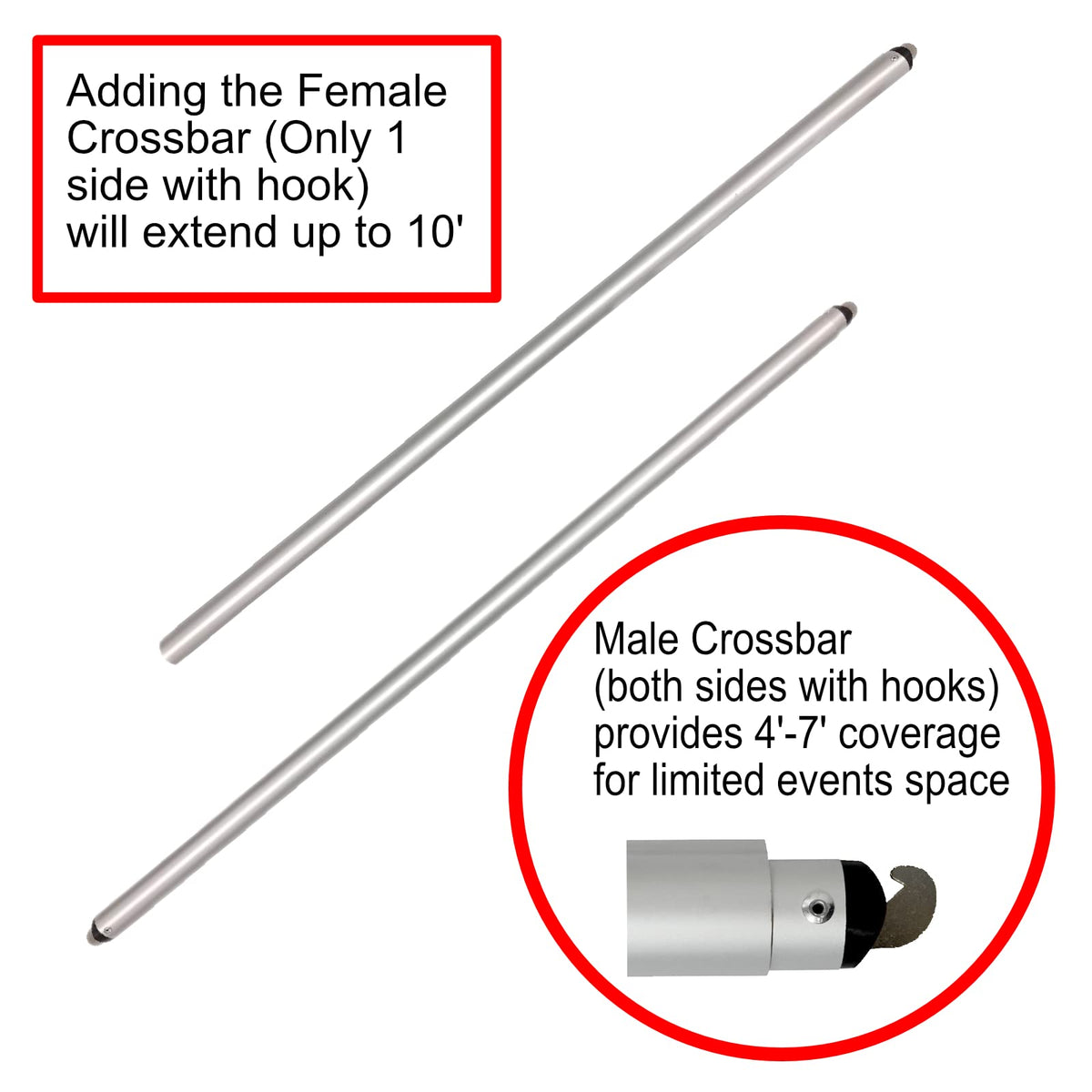 Q: What is the adjustable range of the crossbars?A: The crossbars can be adjusted from 4 feet to 10 feet in width. The male crossbar provides coverage from 4 to 7 feet, and by adding the female extension crossbar, you can extend the coverage up to 10 feet.