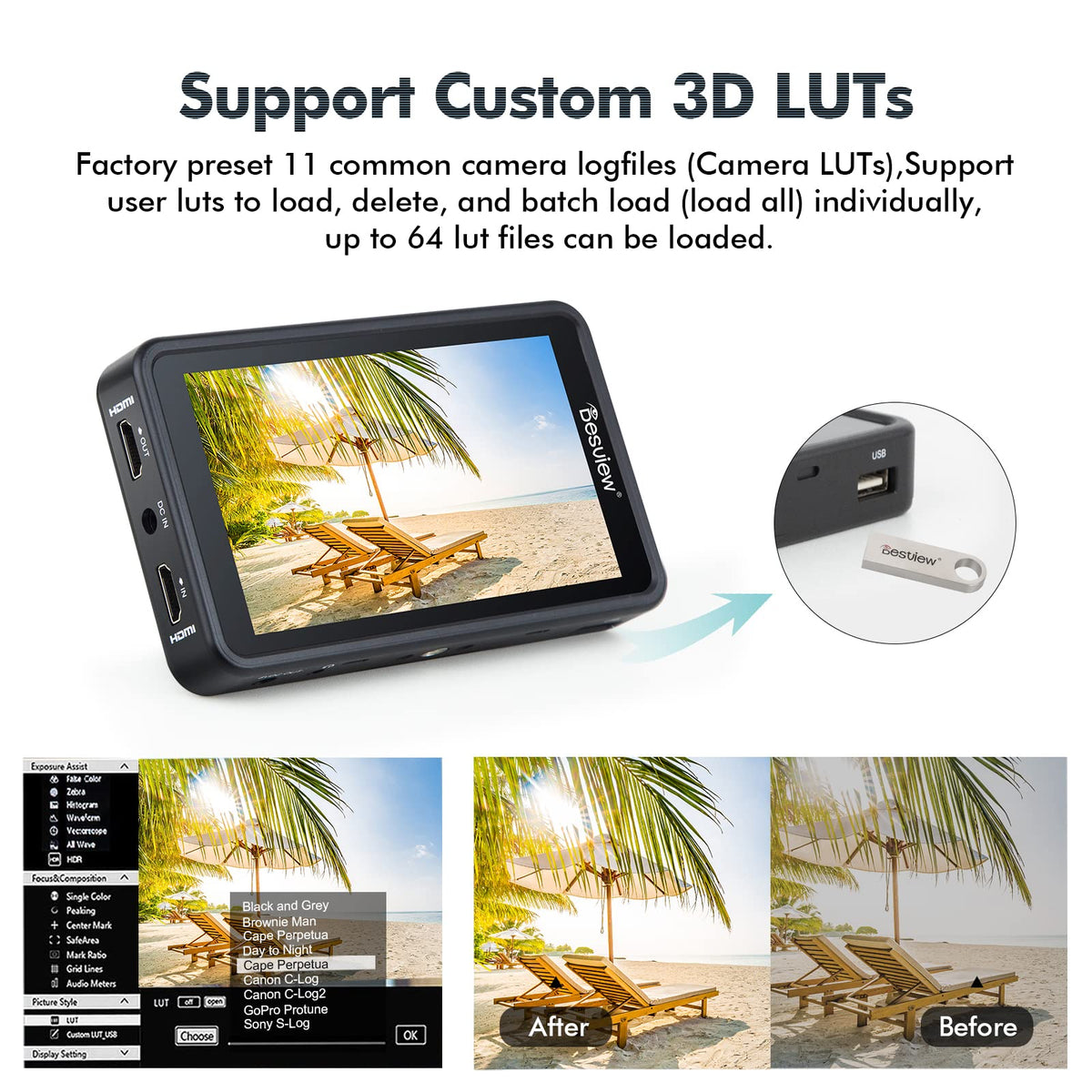 Q: Does the monitor support 3D LUTs and how can I use them?A: Yes, the Desview R5II supports 3D LUTs, allowing you to apply custom color profiles. You can use the included USB drive to load your own LUT files directly onto the monitor.