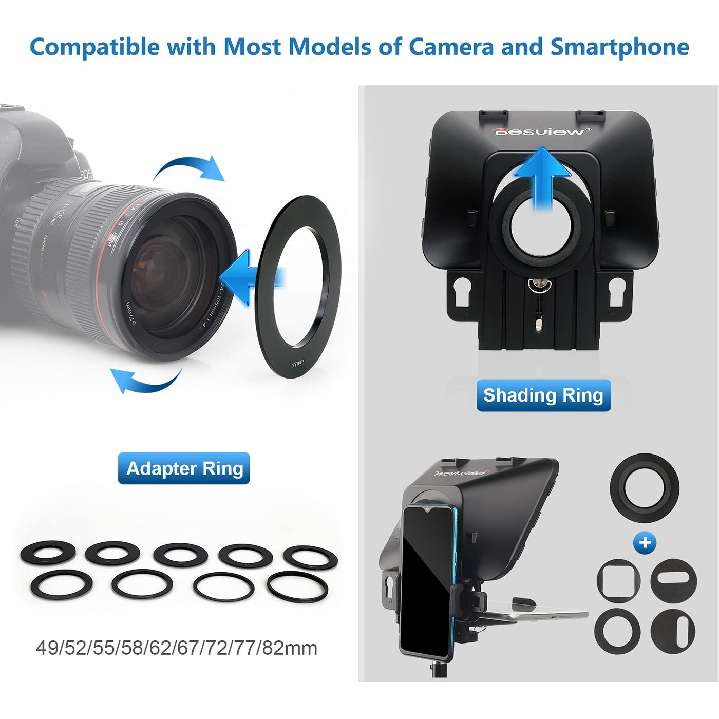 Q: Can I use the Desview T3 teleprompter with my DSLR camera?A: Yes, the Desview T3 teleprompter is designed to be compatible with DSLR and mirrorless cameras. It includes lens adapter rings to ensure a tight fit between your camera and the teleprompter.