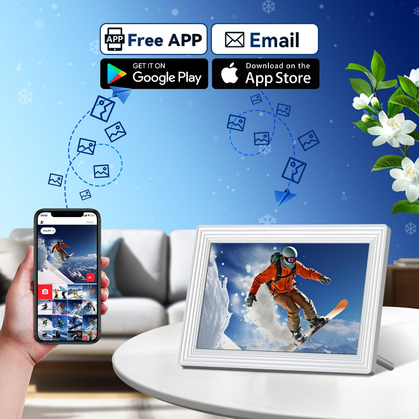 Q: How does the digital picture frame connect to Wi-Fi?A: The digital picture frame connects to Wi-Fi through the companion app, available for both Android and iOS devices. Once the app is downloaded, you can easily connect the frame to your home Wi-Fi network to start sharing photos and videos instantly.