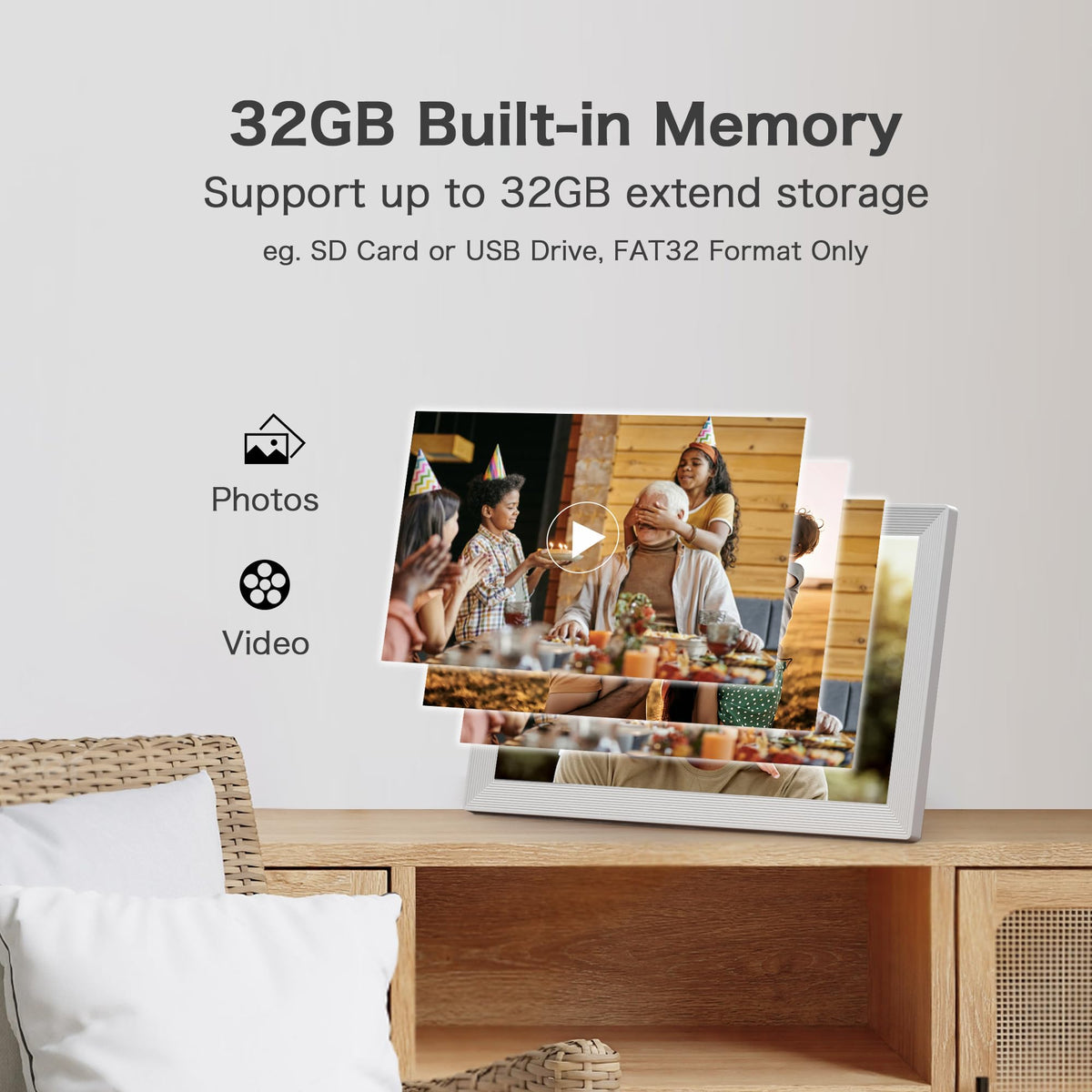 Q: What is the storage capacity of the Pastigio Digital Picture Frame?A: The Pastigio Digital Picture Frame comes with 32GB of built-in memory, allowing you to store over 50,000 photos. It also supports additional external storage of up to 32GB for even more photo sharing options.