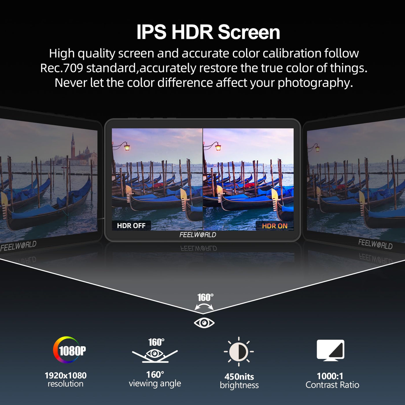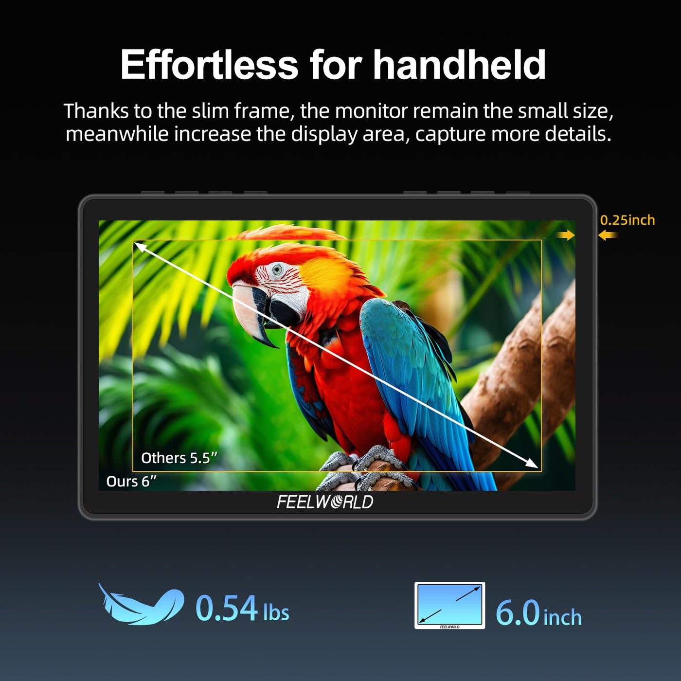 Q: What is the display resolution of the FEELWORLD F5 Pro V4 monitor?A: The FEELWORLD F5 Pro V4 monitor features a 6-inch display with a resolution of 1920x1080P, providing clear and vibrant visuals for your video work.