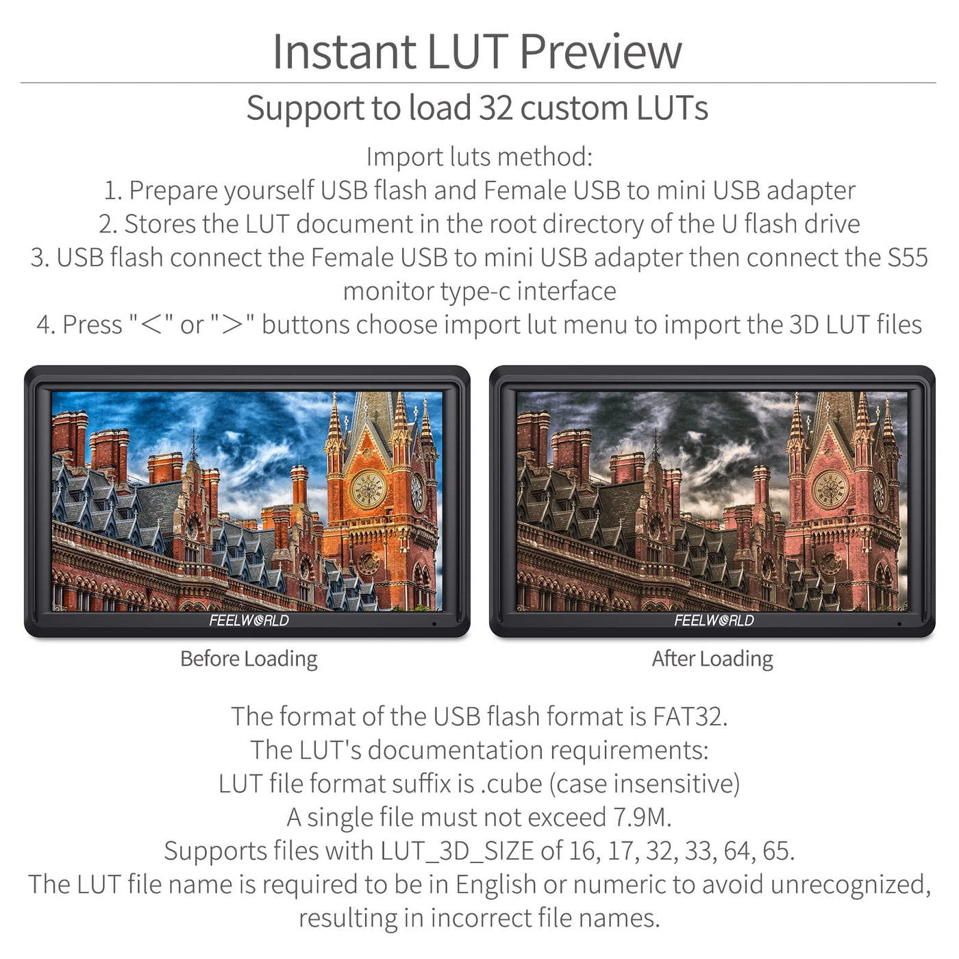 Q: What is the resolution of the FEELWORLD S55 monitor?A: The FEELWORLD S55 monitor features a Full HD resolution of 1920x1080 pixels, providing bright and clear images for an enhanced viewing experience.