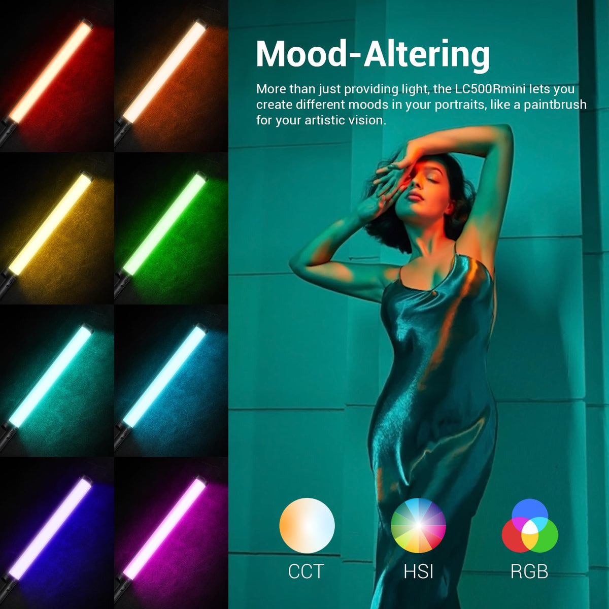 Q: What are the key features of the Godox LC500R Mini Handheld RGB Tube Light?A: The Godox LC500R Mini Handheld RGB Tube Light features a color temperature range of 2500K to 8500K, 360° full color, and 0-100% dimming capabilities. It includes CCT, HSI, and FX modes, along with 15 FX effects such as RGB Cycle, Party, and Fireworks, and can be controlled using the Godox Light APP.