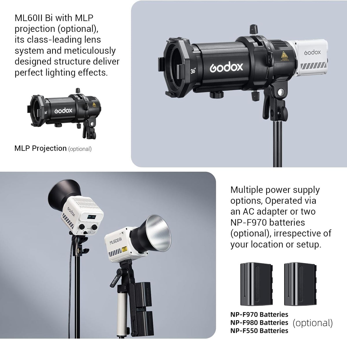 Q: What accessories are compatible with the Godox ML60IIBi?A: The Godox ML60IIBi is compatible with various Godox accessories, including the MLP projection, ML-SF3030 softbox, and ML-CD15 soft diffuser. It features a secure Godox mount and a 1/4" threaded hole for additional lighting accessories.