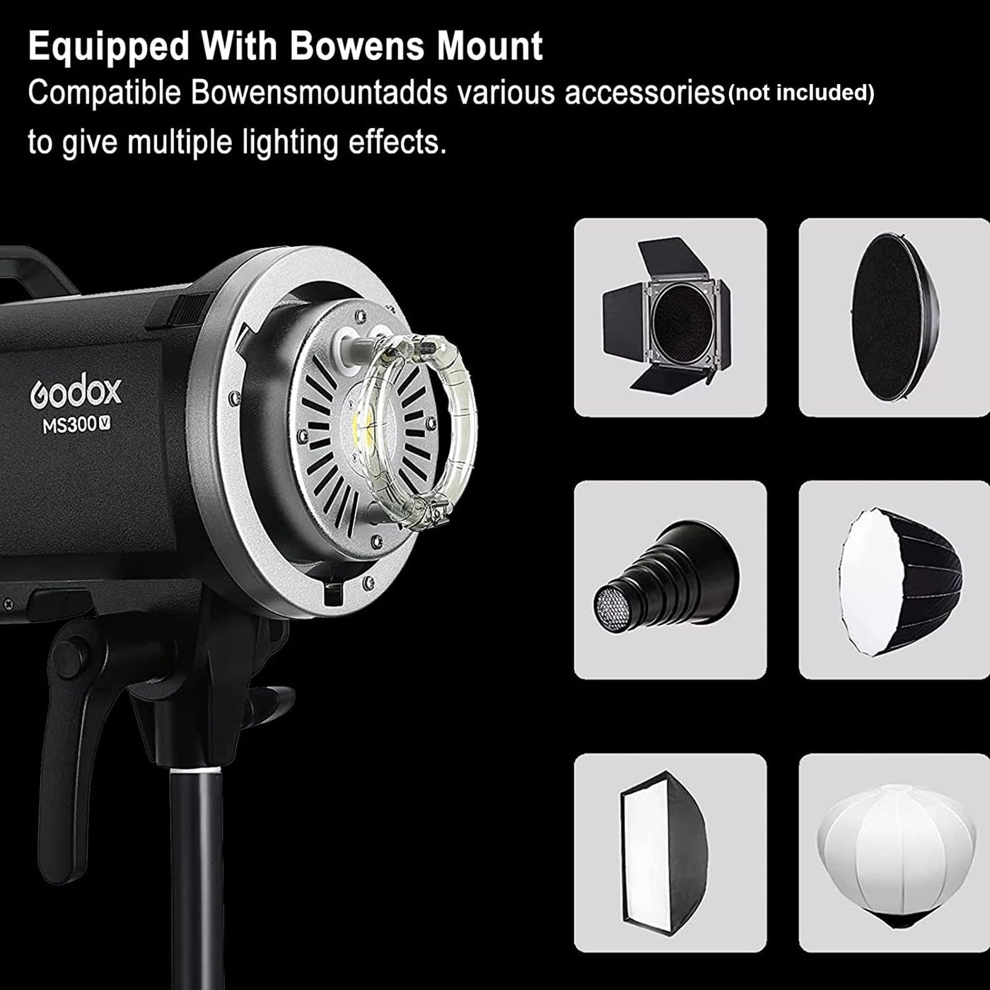 Q: Is the Godox MS300-V compatible with Bowens mount accessories?A: Yes, the MS300-V is equipped with a standard Bowens mount, which allows for quick installation of various Bowens mount light accessories such as softboxes and reflectors, enhancing your studio lighting setup.