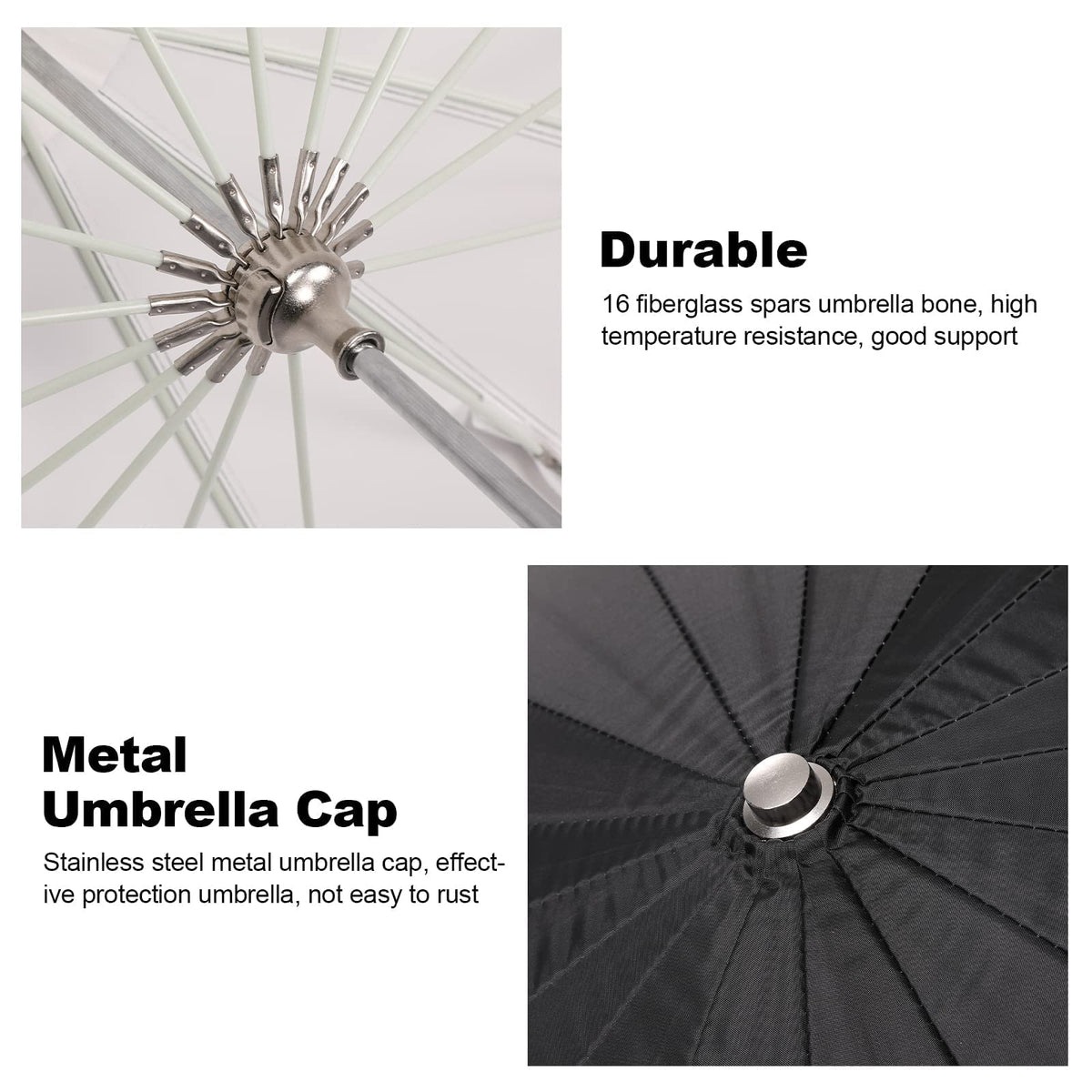 Q: What materials are used in the construction of the Godox UB-130W umbrella?A: The Godox UB-130W is constructed from high-quality reflective fabric supported by 16 stainless steel glass fibers. This design ensures high temperature resistance and durability, allowing for even light diffusion and maintaining a consistent color temperature during use.