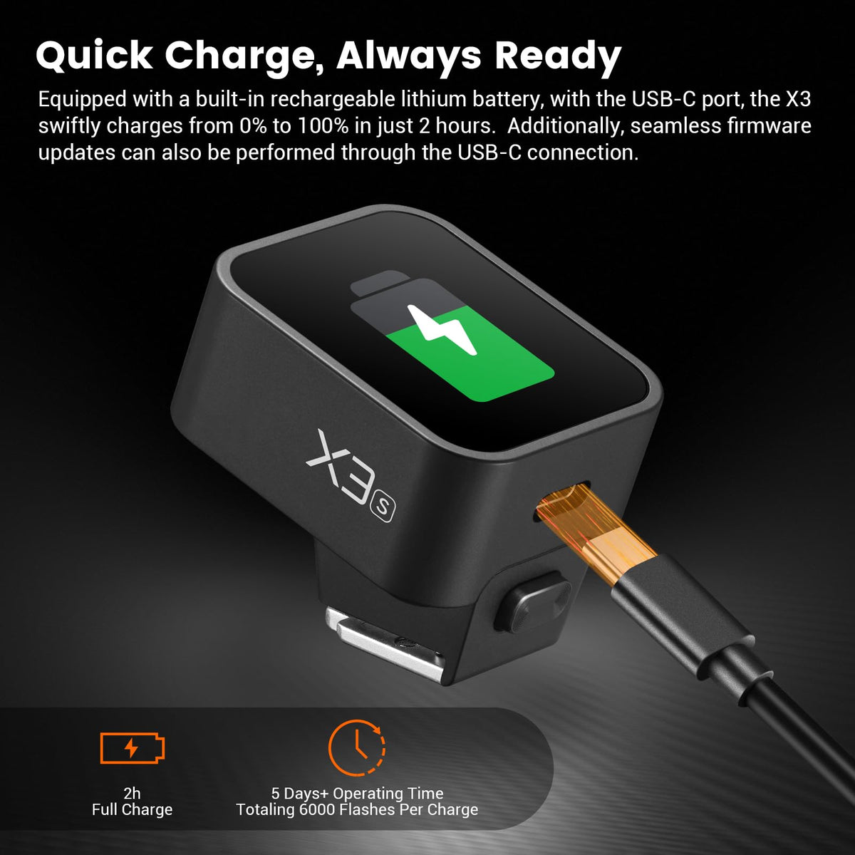 Tech Specs Model: X3S Compatible Cameras: Sony Cameras(Ttl Autoflash) Built-In Lithium Battery: 3.7V?850Mah Charging Time: 2H Standby Time: 7 Days Ttl Auto Flash: V Manual Flash: V Multi Flash: V High Speed Sync: V Front Curtain Sync: V Rear Curtain Sync: V Flash Exposure Compensation: +3Ev (Exposure Value) , Adjustable In 1/3 Ev Increment Modeling Lamp Flash: Control The Modeling Lamp By Flash Trigger Buzz: Control The Buzz By Flash Trigger Zoom Setting: Auto/Focus Length 24-200Mm Tcm Transform: Transform The Ttl Shooting Value Into The Output Value In The M Mode Firmware Upgrade: Upgrade Through The Usb-C Port Memory Function: Settings Will Be Stored 2 Seconds After Last Operation And Recover After A Restart Display Panel: Touch Screen With Adjustable Brightness Transmission Range (Approx.): 0-100M Built-In Wireless: 2.4Ghz Channel: 32 Wireless Id: Off/01-99 Group: A-F, 0-9 Dimension: 1.61''*1.85''X1.54'' Net Weight: 48G What'S In The Box 1X X3-S Sony Flash Trigger 1X Usb-C Charging Cable 1X Storage Bag 1X Letwing Cleaning Cloth