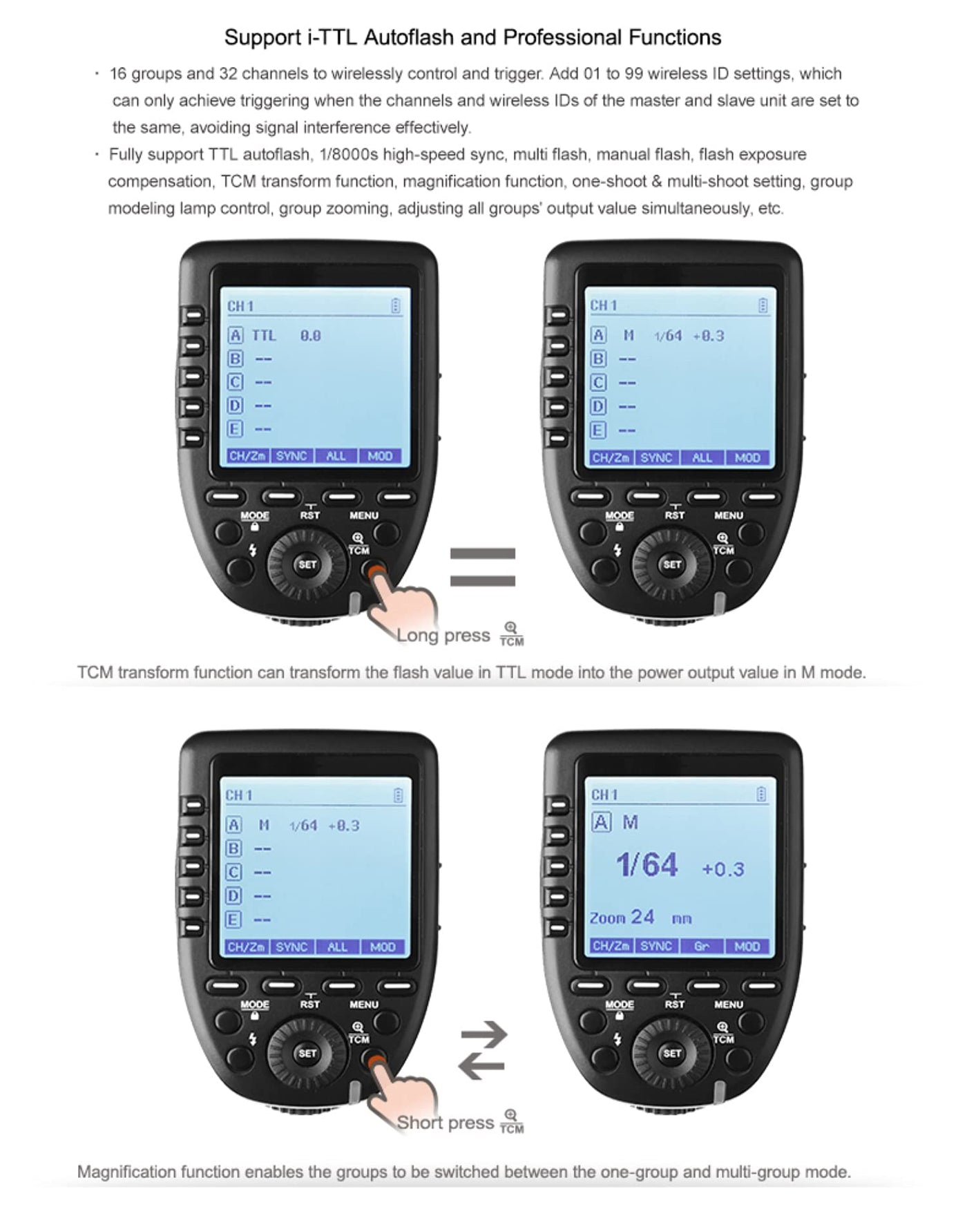 Q: What are the main features of the Godox Xpro-N that enhance its usability?A: The Godox Xpro-N includes several features that enhance usability, such as 16 groups and 32 channels for wireless control, a large dot-matrix LCD display for easy navigation, 5 group buttons for convenient manipulation, and the Smart TCM function for transforming TTL values into output values in manual mode.