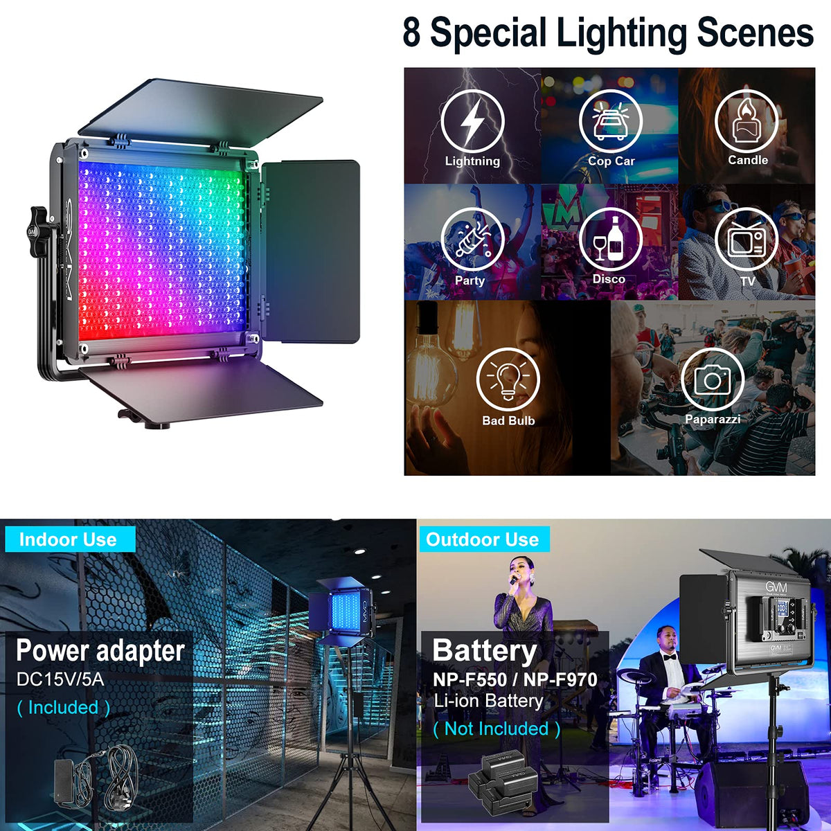 Q: Is the GVM 65W RGB Video Light suitable for outdoor use?A: Yes, the GVM 65W RGB Video Light can be used outdoors when powered by NP-F550 or NP-F970 batteries, making it ideal for on-location shoots, streaming, and outdoor photography, provided you have the appropriate batteries.