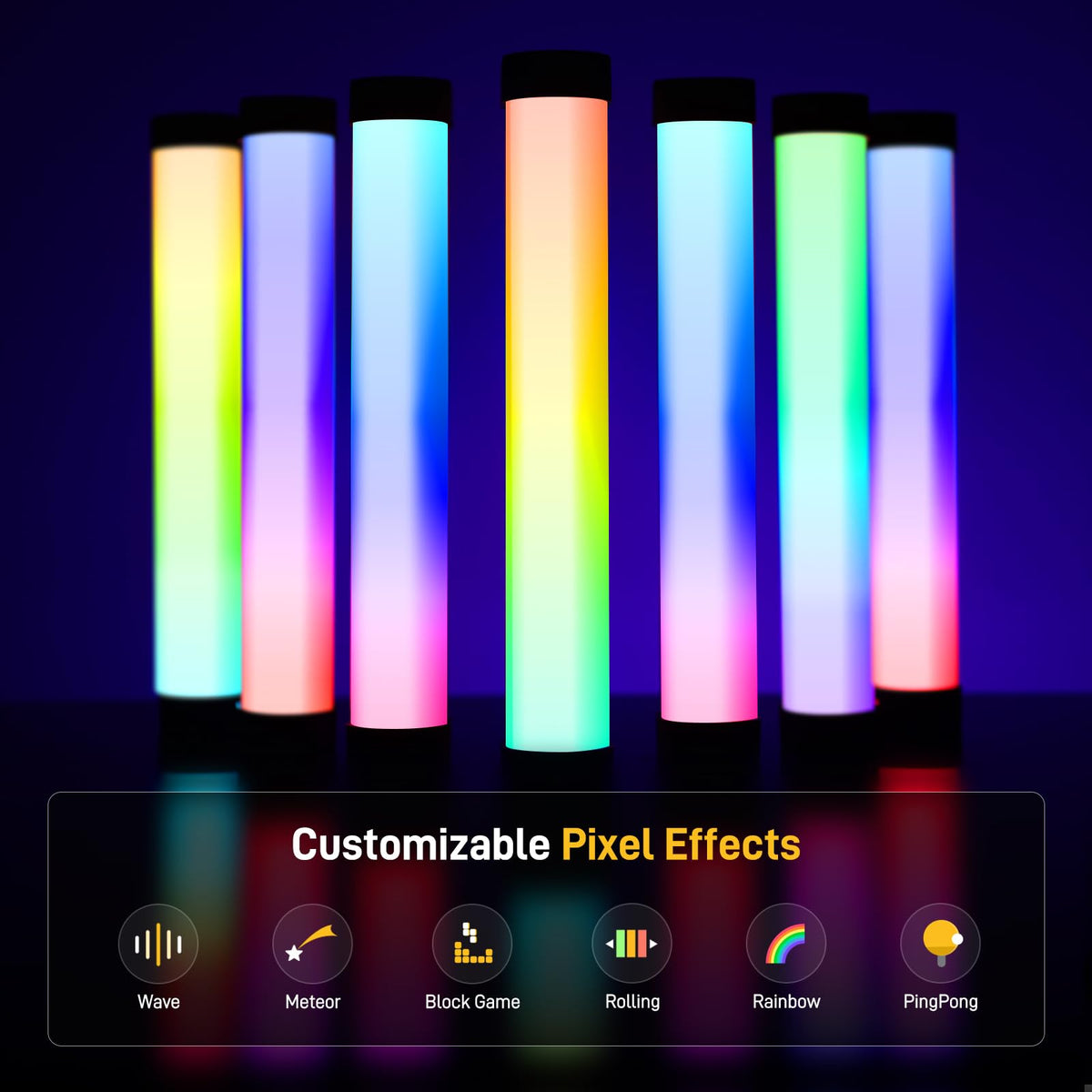 Q: What are the key features of the GVM BX8C RGB Tube Light?A: The GVM BX8C RGB Tube Light features RGBWW light mixing technology for a full color spectrum, adjustable color temperature from 2000K to 10000K, 6 pixel effects, 12 special scene effects, Bluetooth Mesh control, and a rechargeable 3300mAh battery with a 120-minute runtime at full power.