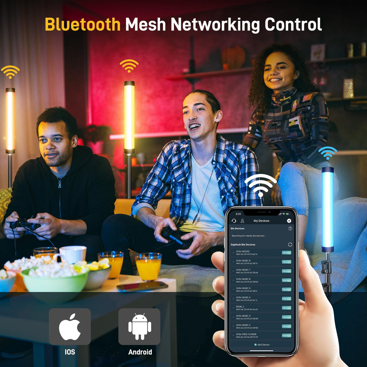 Q: How does the Bluetooth control work for the GVM BX8C?A: The GVM BX8C is equipped with Bluetooth 5.0 Mesh networking, allowing you to control multiple GVM lights of different models simultaneously through the mobile app available on iOS and Android. The app provides an intuitive control panel for easy lighting scene management.