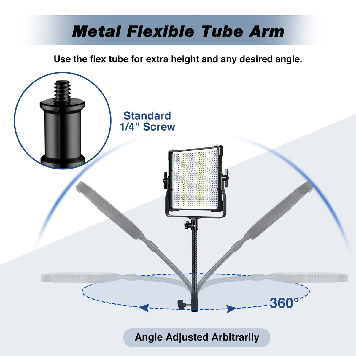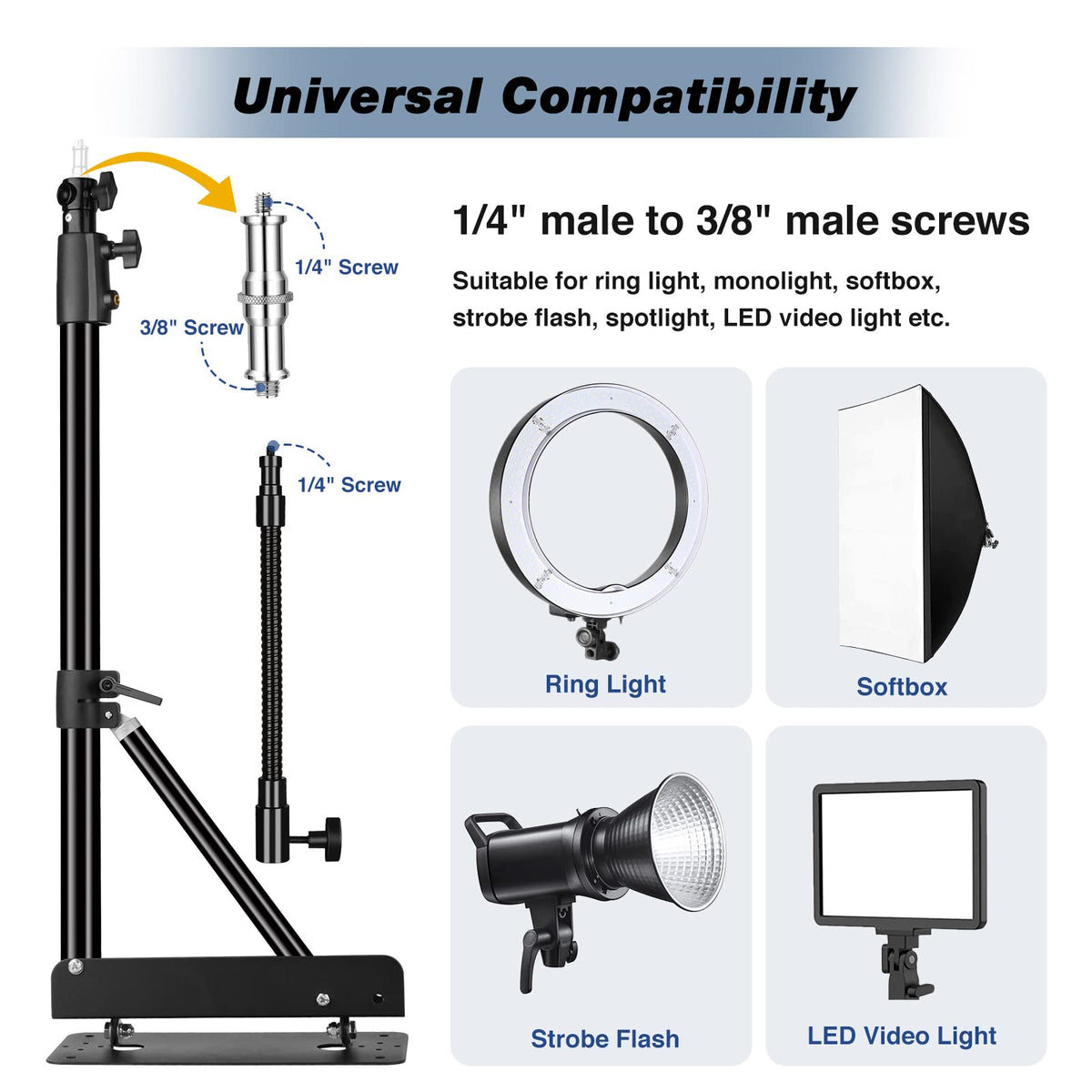 Q: Is this boom arm compatible with different types of photography equipment?A: Yes, the boom arm is equipped with a 1/4" male to 3/8" male thread screw adapter, making it compatible with various photography equipment such as ring lights, strobe lights, softboxes, and DSLRs.
