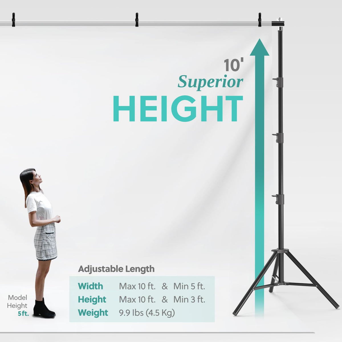 Q: What is the maximum height and width of the LimoStudio Backdrop Stand?A: The LimoStudio Backdrop Stand can be adjusted to a maximum height of 10 feet and a width of 10 feet, making it suitable for various photography and videography setups.