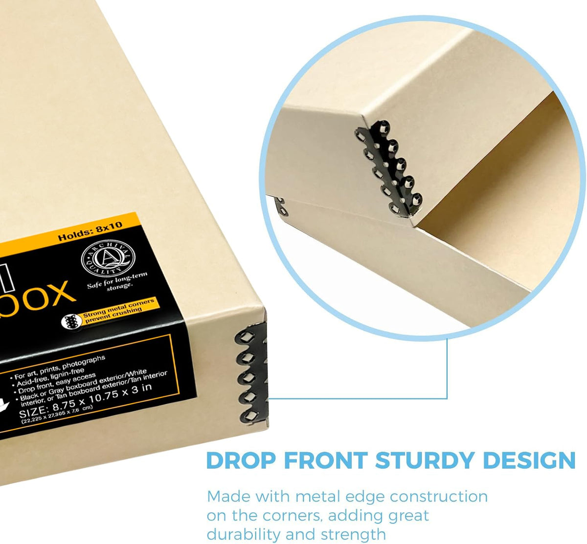 Lineco, 8X10 Tan Museum Archival Storage Box, Drop Front Design. Acid-Free With Metal Edge. Preserves Pic Longevity, Organize Ph
