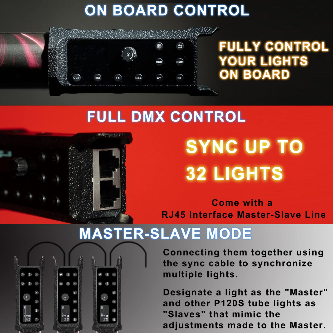 Q: Can I connect multiple LUXCEO P120S lights together?A: Yes, you can connect multiple LUXCEO P120S tube lights using a sync cable. Designate one light as the 'Master' to control the settings of the connected 'Slave' lights for synchronized operation.