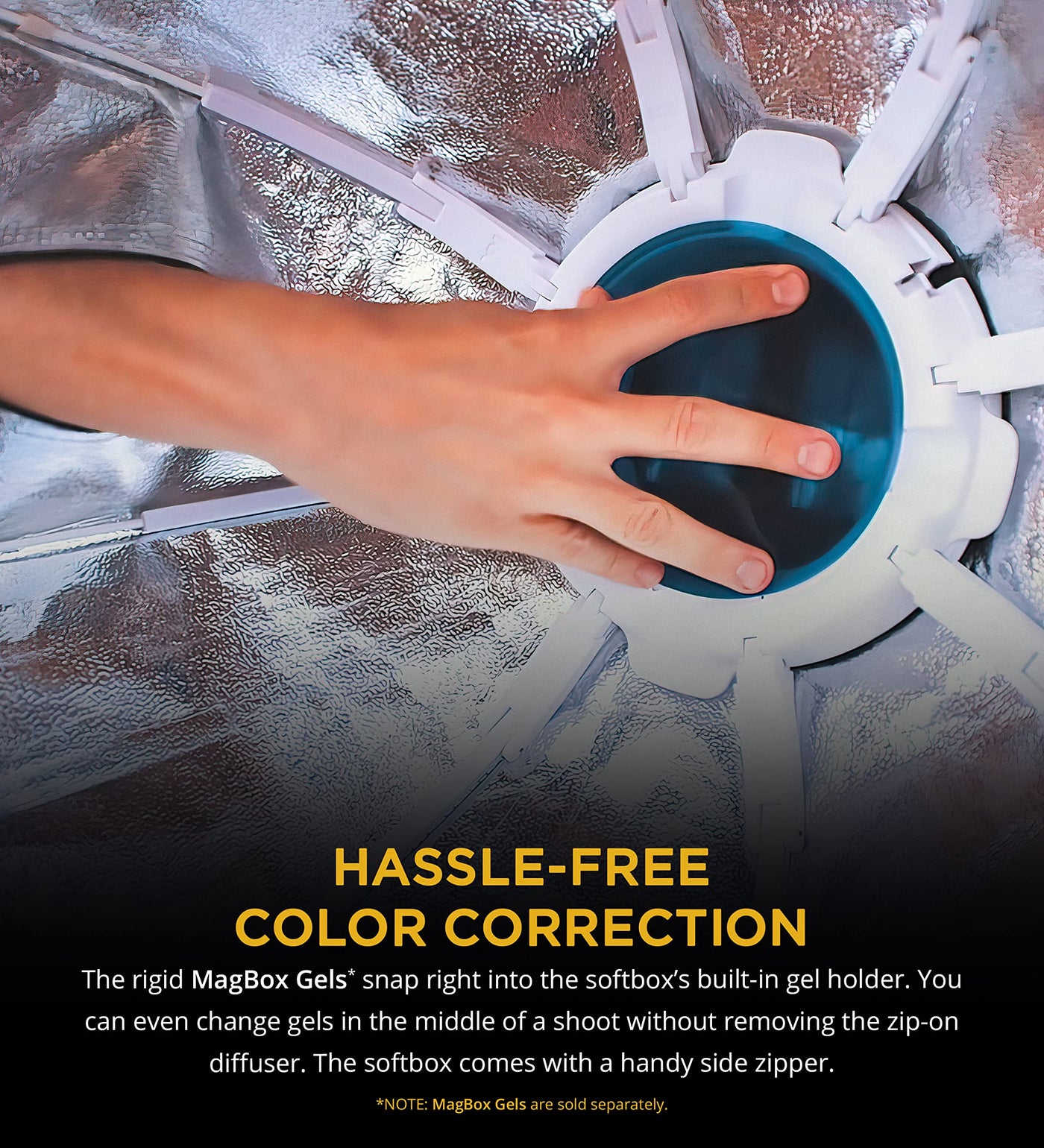 Q: Can I use color gels with the MagBox PRO, and how do I change them?A: Yes, you can use color gels with the MagBox PRO. It features an integrated gel slot that allows you to easily slip one or two MagBox Gels in to adjust your flash color or create dynamic effects. You can change the gels during a shoot by using the side zipper without having to remove the diffusion panel.
