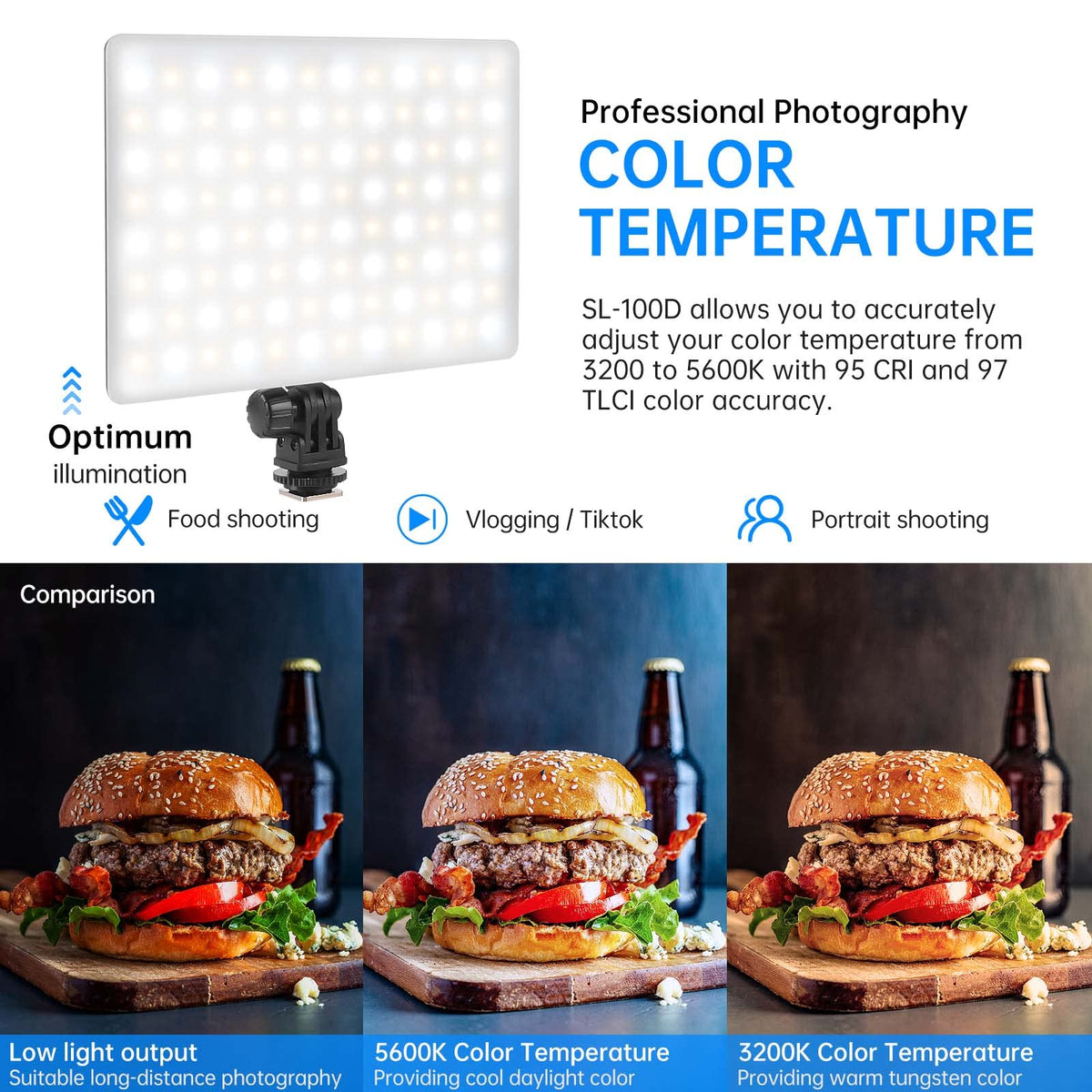Q: What are the key features of the Mettlelite SL100D LED Video Light?A: The Mettlelite SL100D LED Video Light features a high color rendering index (CRI95+) for accurate color representation, adjustable brightness from 0-100%, and a color temperature range of 3200K to 5600K. It also includes an integrated diffuser for softer lighting and is lightweight and compact, making it ideal for on-the-go photography and video recording.