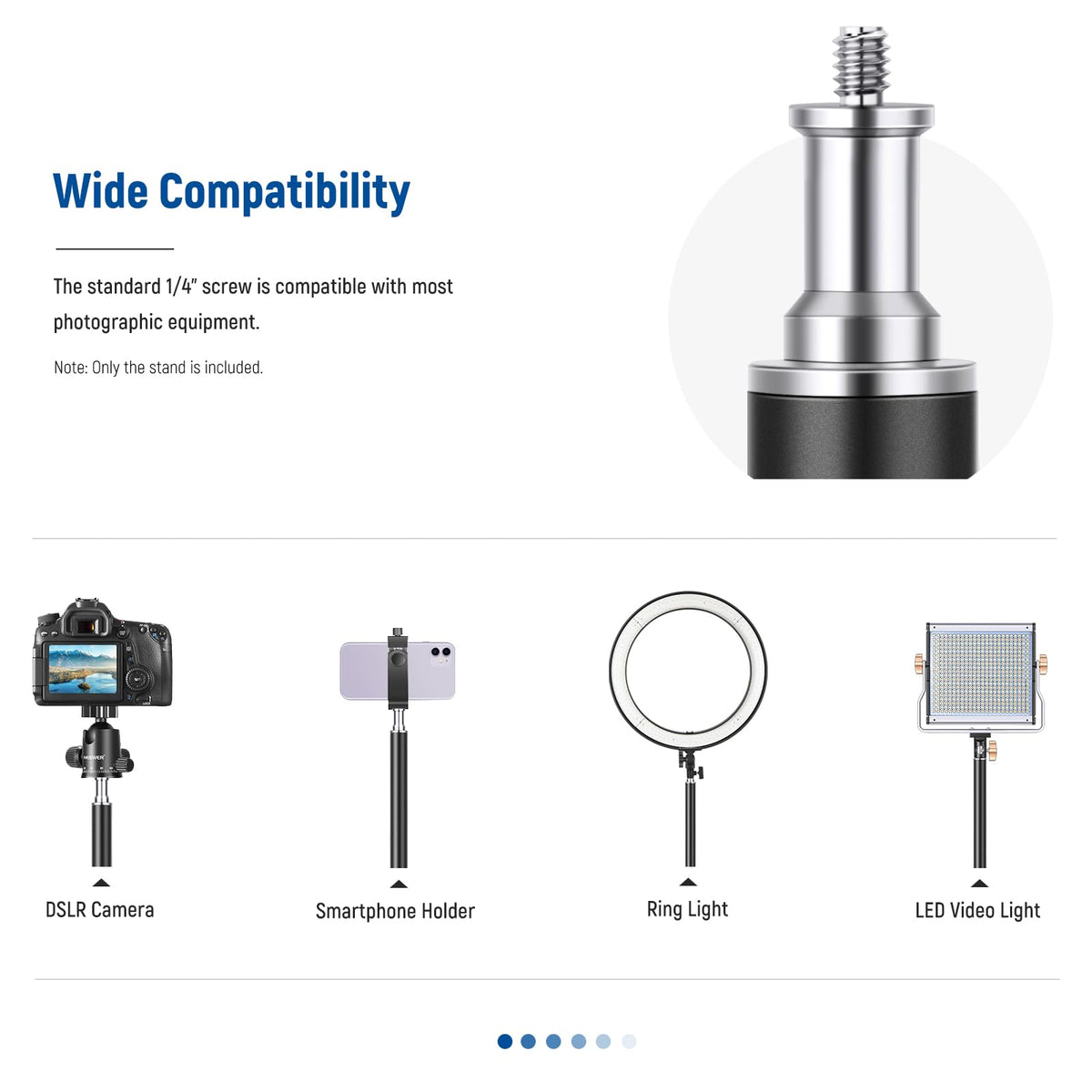 Q: What devices are compatible with the NEEWER Camera Desk Mount?A: The NEEWER Camera Desk Mount is compatible with a variety of devices including DSLR cameras, camcorders, digital cameras, microphones, LED video lights, ring lights, phone holders, and field monitors. It features a 1/4" screw and a detachable hot shoe adapter for easy installation.