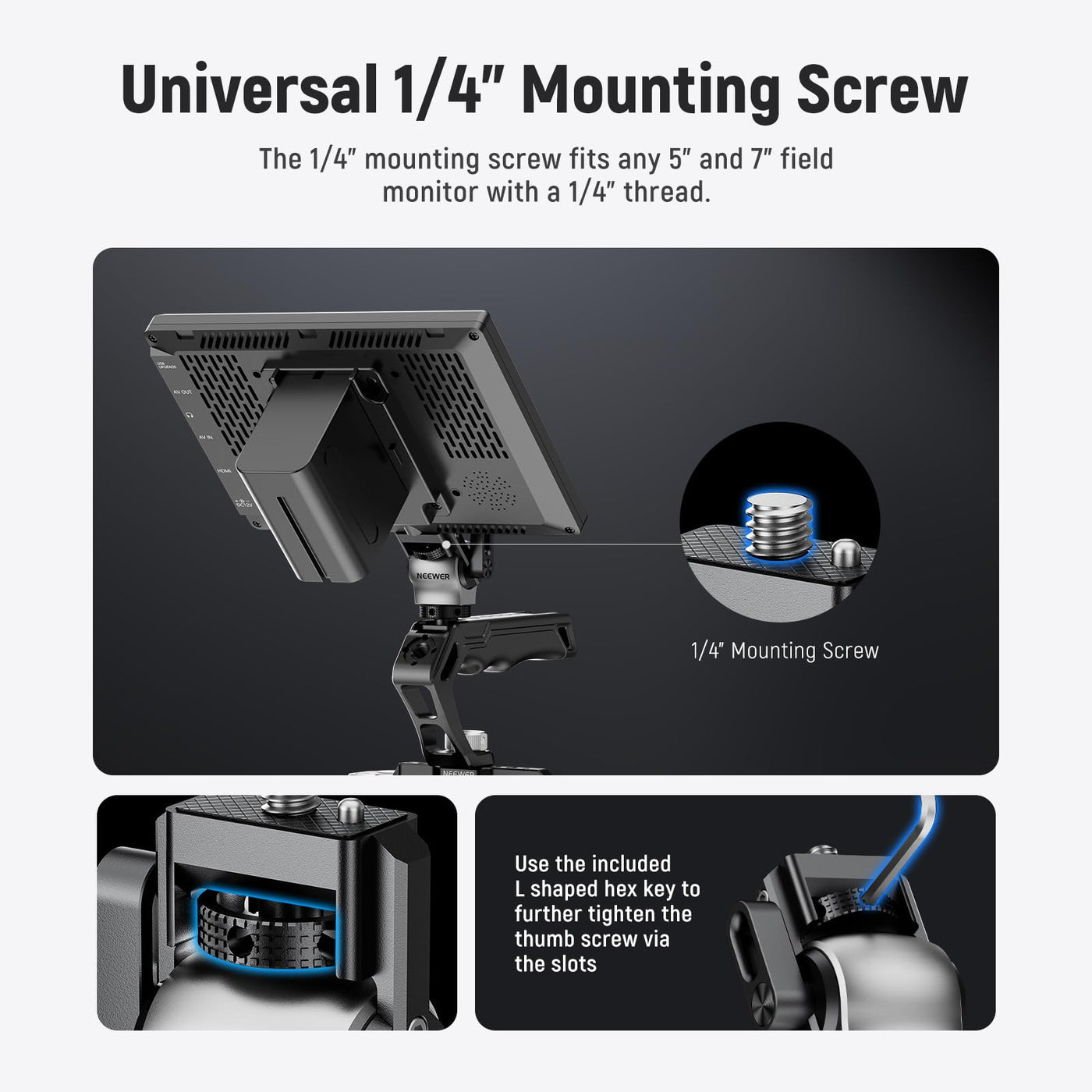 Q: How do I securely attach my monitor to the mount?A: The mount features a universal 1/4" mounting screw which fits any compatible monitor with a 1/4" thread. You can use the hand-tightened thumb screw for easy mounting, and an included L-shaped hex key for further tightening if necessary.