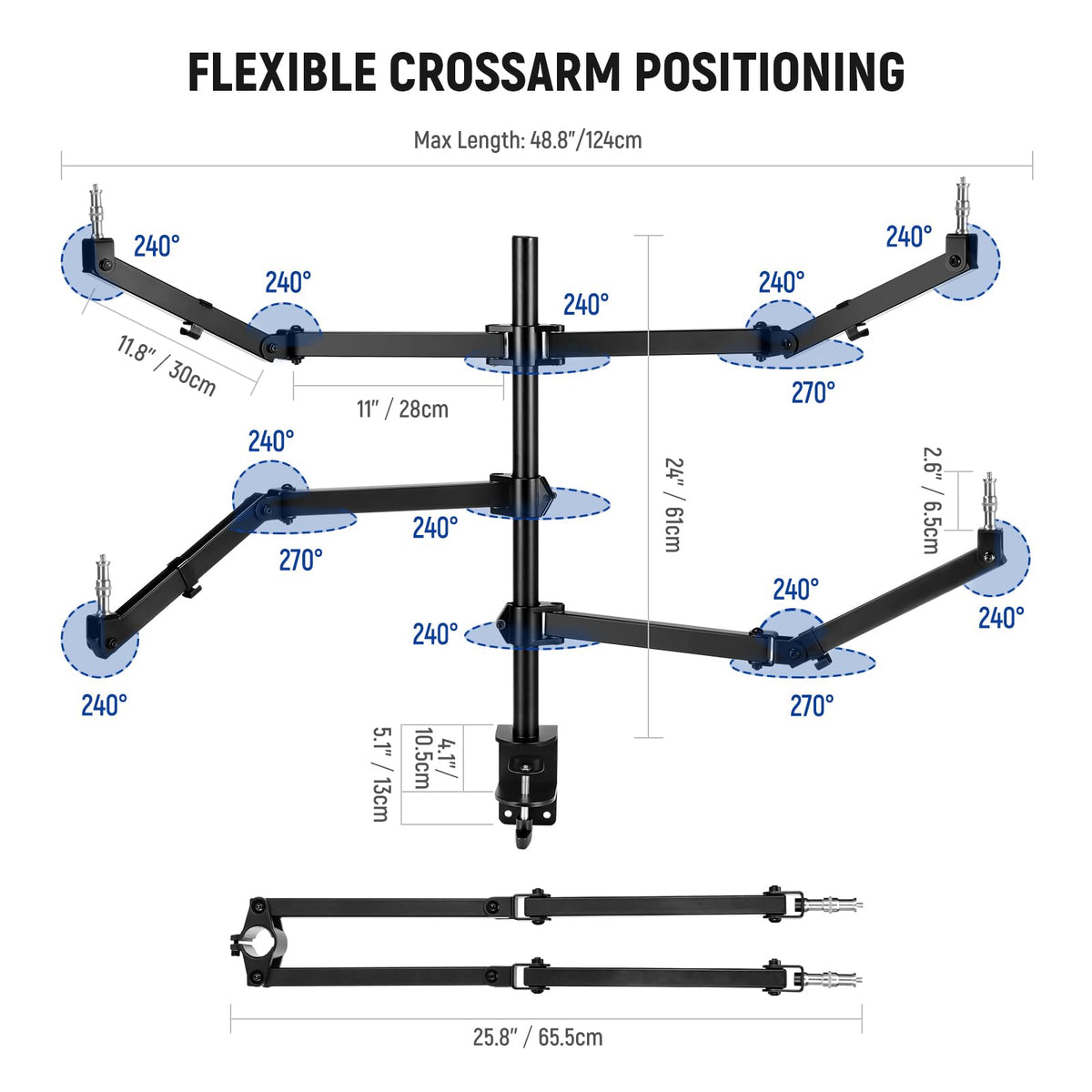 Neewer St004 Live Broadcast Desk Stand Can Turn Your Desk Into A Professional Studio For Live Streaming, Video Conferencing, Gaming, Online Teaching, And Podcasting. Crafted With Rugged Aluminum Alloy, The Center Column With A Heavy Duty Desk Clamp Can Fit On Desks 0.4''-3.3'' (10-85Mm) Thick For Stable Mounting. Two Single Cross Arms And A Double Cross Arm Feature A 5.5Lb (2.5Kg) Load Capacity Each, And The Screw Tension Is Adjustable Via L Shaped Hex Keys. Arms Enable 270 Rotation And 240 Tilts For Flexible Placement. With 1/4'' To 3/8'' Reversible Screws, 1/4'' To 3/8'' Screw Adapters, And 3/8'' To 5/8'' Screw Adapters, The Stand Can Simultaneously Mount Various Devices, Including Microphones, Cameras, Monitors, And Led Lights, For A Professional Live Streaming Setup. The Stand Comes With Several Accessories, Such As Cable Fasteners, Hex Key Holders, And L Shaped Hex Keys For Convenient And Efficient Live Streaming And Video Recording. Specifications Model: St004 Material: Aluminum Alloy Weight: 11Lb/5Kg Load Capacity: 5.5Lb/2.5Kg Center Column Diameter: 1.3''/32Mm Center Column Length: 23.6''/60Cm Maximum Working Height: 36.2''/92Cm Package Contents 1 X Center Column 2 X Single Side Cross Arm 1 X Dual Side Cross Arm 2 X Hex Key Holder 4 X Cable Tie 2 X 1/4'' To 3/8'' Screw Adapter 2 X 3/8'' To 5/8'' Screw Adapter 2 X L Shaped Hex Key 1 X User Manual