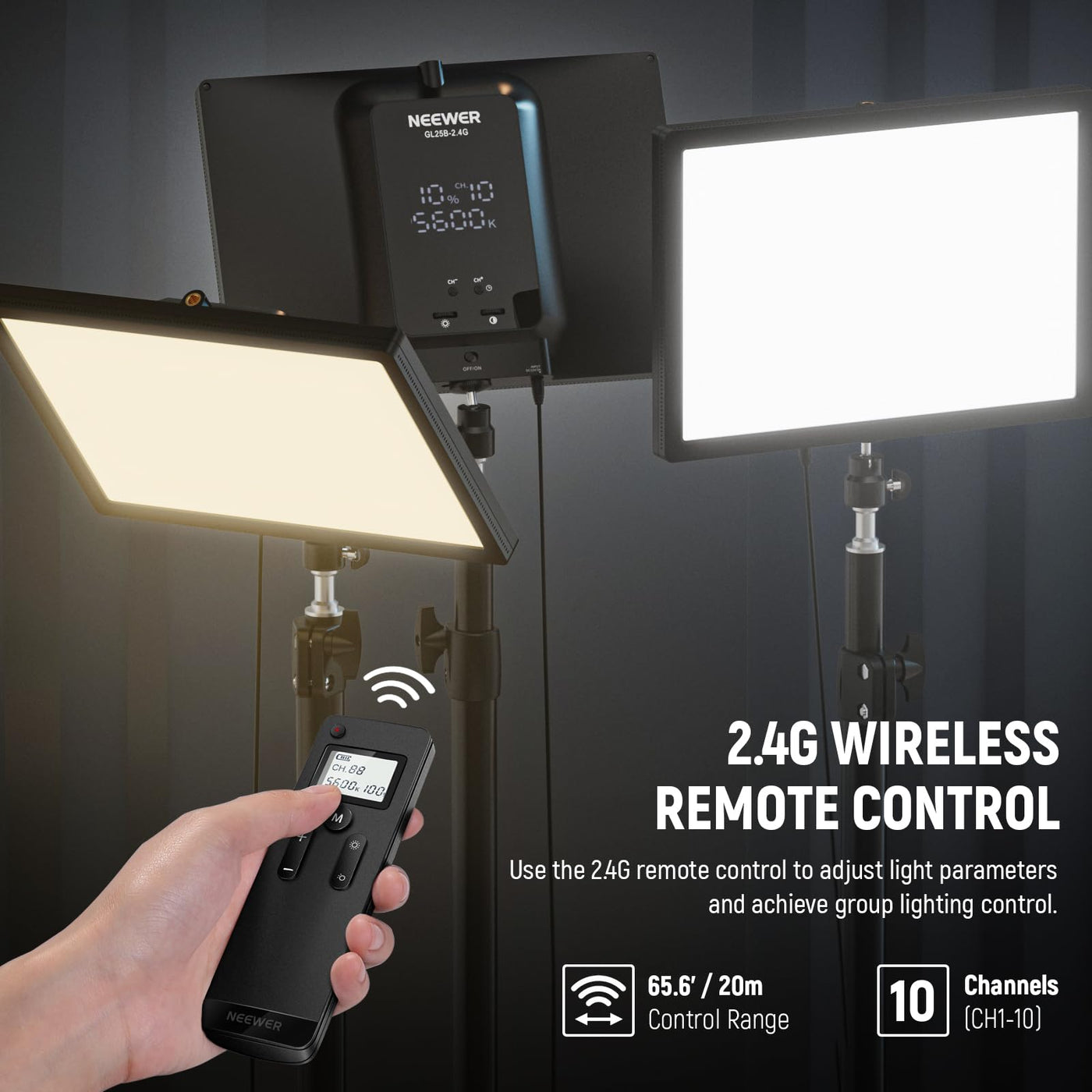 With 176 Leds And An Innovative Edge Emitting Panel, Gl25B Delivers Soft And Balanced Lighting Without Shadows. The 25W Power Output, 0-100% Infinite Dimming Range, 2900K-7000K Tunable Color Temperature, And 2300Lux/0.5M Illuminance Help You Match Various Ambient Lights And Get Smooth Skin Complexions In A Second.Use The Included Rt100 Remote Or Neewer Live 2.4G App For Wireless Control. Plug 2.4G Usb Transmitter Into Laptop, Download The App To Effortlessly Control Your Lighting Setup Without Internet. Also Compatible With Gl1, Gl1 Pro, Gl1-C, Bh40B, Rp16, Srp18, P200-2.4G, P280-2.4G, P600-2.4G, Rp18H, T140, Nl660-2.4G, Nl480-2.4G, Nl1920-2.4G, Nl1320-2.4G, Cl124-2.4G.With A Professional Hardware Circuit, The Light Offers 25W Power Output And A Continuous Light Source Without Flickers-Easy On The Eyes After Hours Of Illumination. High Cri 98+ Ratings Ensure Faithful Color Reproduction.The Light Panel Uses Thermally Conductive Material And Features Vents Around Its Frames For Efficient Heat Dissipation. The Groundbreaking Fanless Design Ensures Zero Noise And Offers You Immersive Gaming Experiences.Mounted On The Desk Edge, The Stand With A Ball Head Adapter Can Secure The Light And Enable Height Adjustment And Beam Angle Tilts While Taking Minimal Space. Measuring 10.6'' X 7.4'' X 1.5'' (268 X 188 X 37.25Mm) And Only 22Oz (623G) In Weight, The Light Panel Is Easy To Manipulate.Specificationsmodel: Gl25Bnumber Of Leds: 176Input Voltage: Dc12Vmaximum Power: 25Wmaximum Illuminance: 2300Lux/0.5Mluminous Flux: 1400Lmcri: 98+Dimming Range: 0-100%Color Temperature: 2900K-7000Kchannels: 0-102.4G Remote Power Source: 2 X Aaa Battery (Not Included)Dimensions (Control Panel Included): 10.6'' X 7.4'' X 1.5''/268 X 188 X 37.25Mmweight: 22Oz/623Gpackage Contents1 X Gl25B Light Panel (With 2.4G Usb Transmitter)1 X Rt100 2.4G Remote 1 X Desktop Stand1 X Ball Head Adapter1 X Power Adapter1 X Power Ca