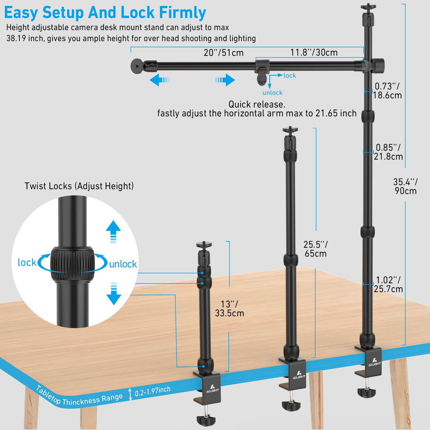 Q: What is the height range of the ailight Overhead Camera Mount Desk Stand?A: The ailight Overhead Camera Mount Desk Stand features a height-adjustable design that extends from 13 inches to 33 inches, allowing you to capture overhead shots or videos from various angles.