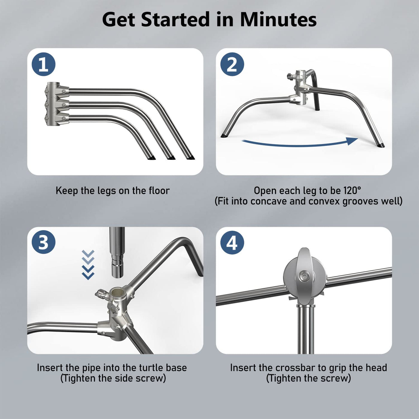 Q: What accessories are included with the C Stand?A: The package includes two center columns, two turtle bases, two extension arms, two grip heads, two sandbags, six backdrop clamps, a user manual, and a one-year warranty.
