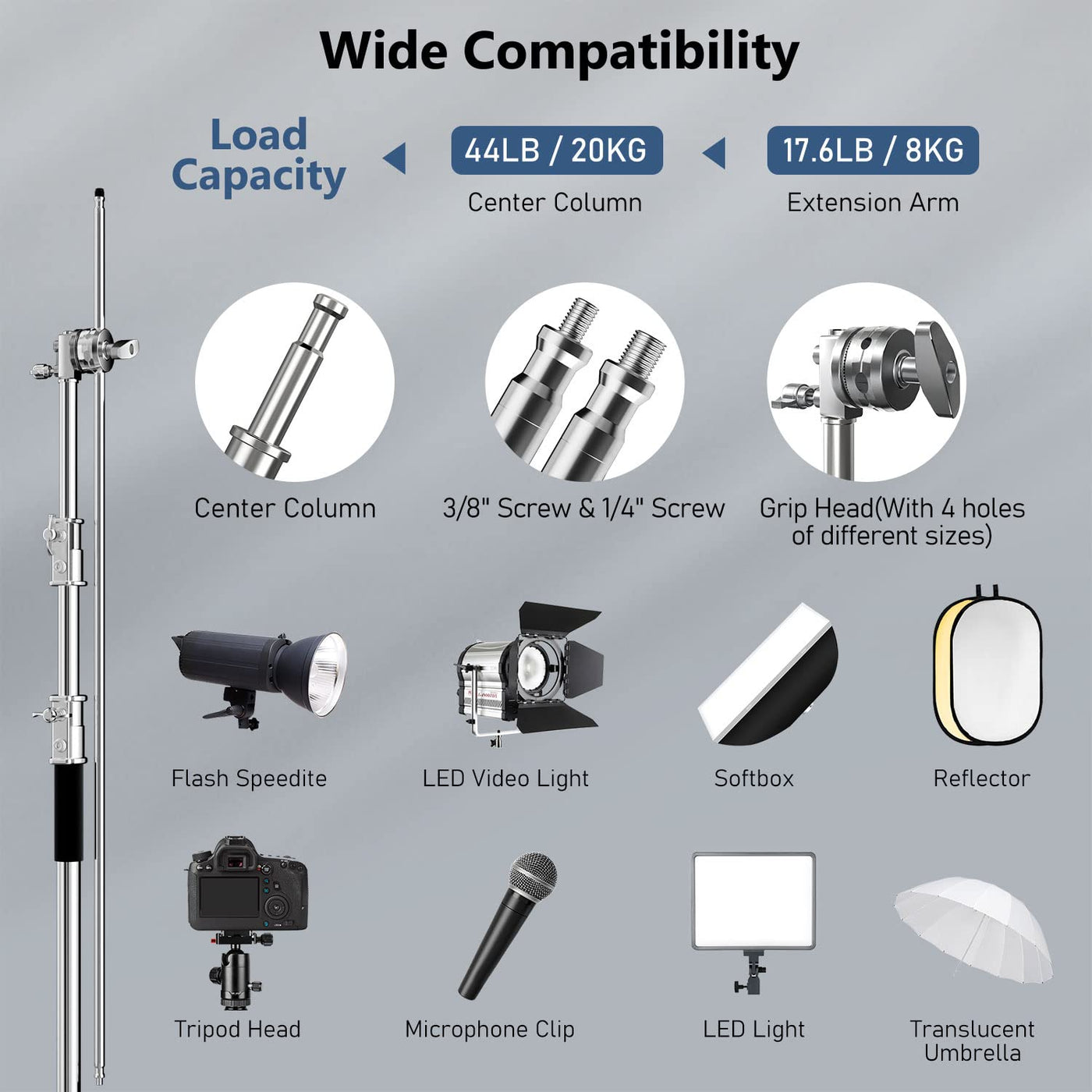 Q: What equipment can I use with the extension arm?A: The 4.2ft (50 inch) extension arm is compatible with most photographic equipment, and it supports a load capacity of up to 17.6 lbs, allowing for versatility in your setups.