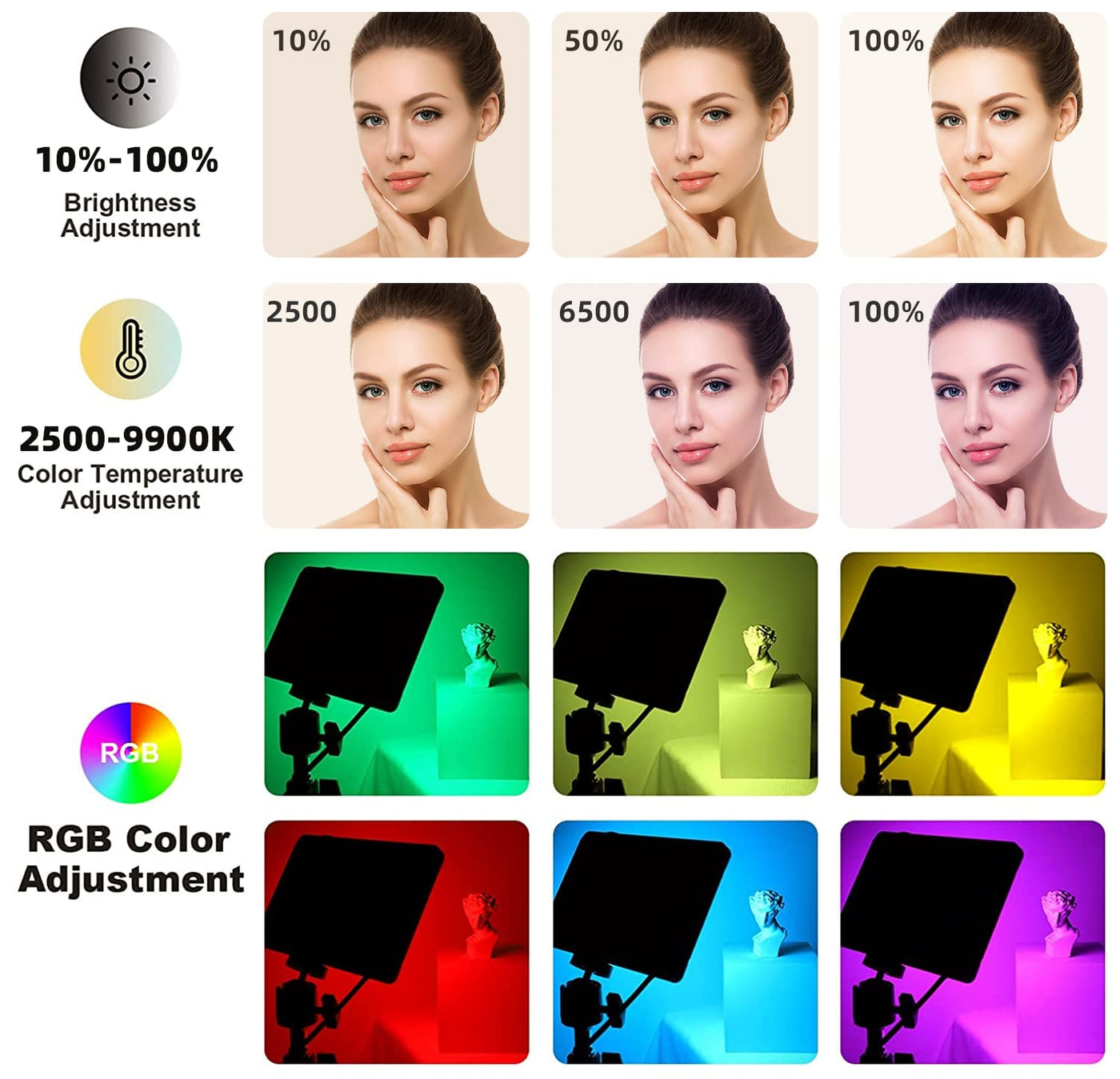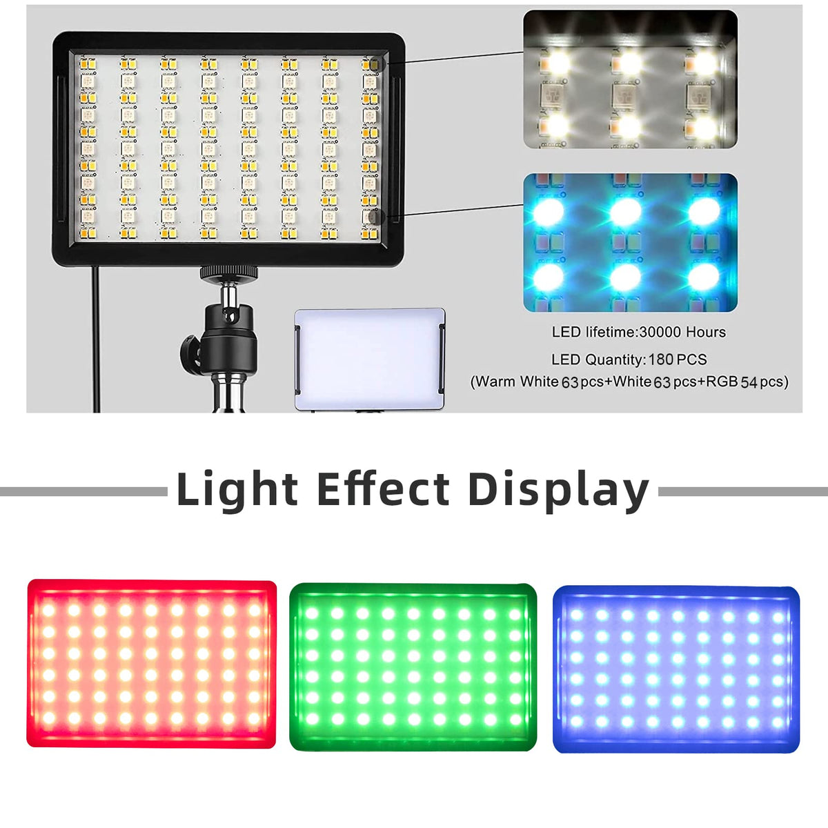Specifications Rgb Led Photography Light Kit 2-Pack Power: 10W Power Input: Usb Dc5V 2A Luminous Flux: 900 Lm Led Qty: 136 Pcs(Warm White 48Pcs +White 48Pcs +Rgb 40Pcs) Color Temperature Range: 2500K-6500K Cri :95+ Brightness Range: 10%-100% Light Effect Mode: Warm White,White,Rgb 7 Scenes And 5 Light Effects Light Panel Size :5.9*3.74 In (15Cm*9.5Cm) Extendable Height :27.17-50.78 Inches(69Cm-122Cm)