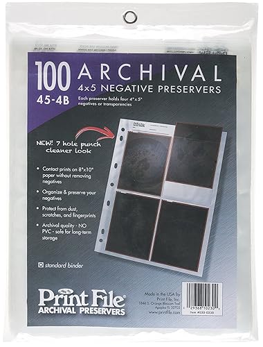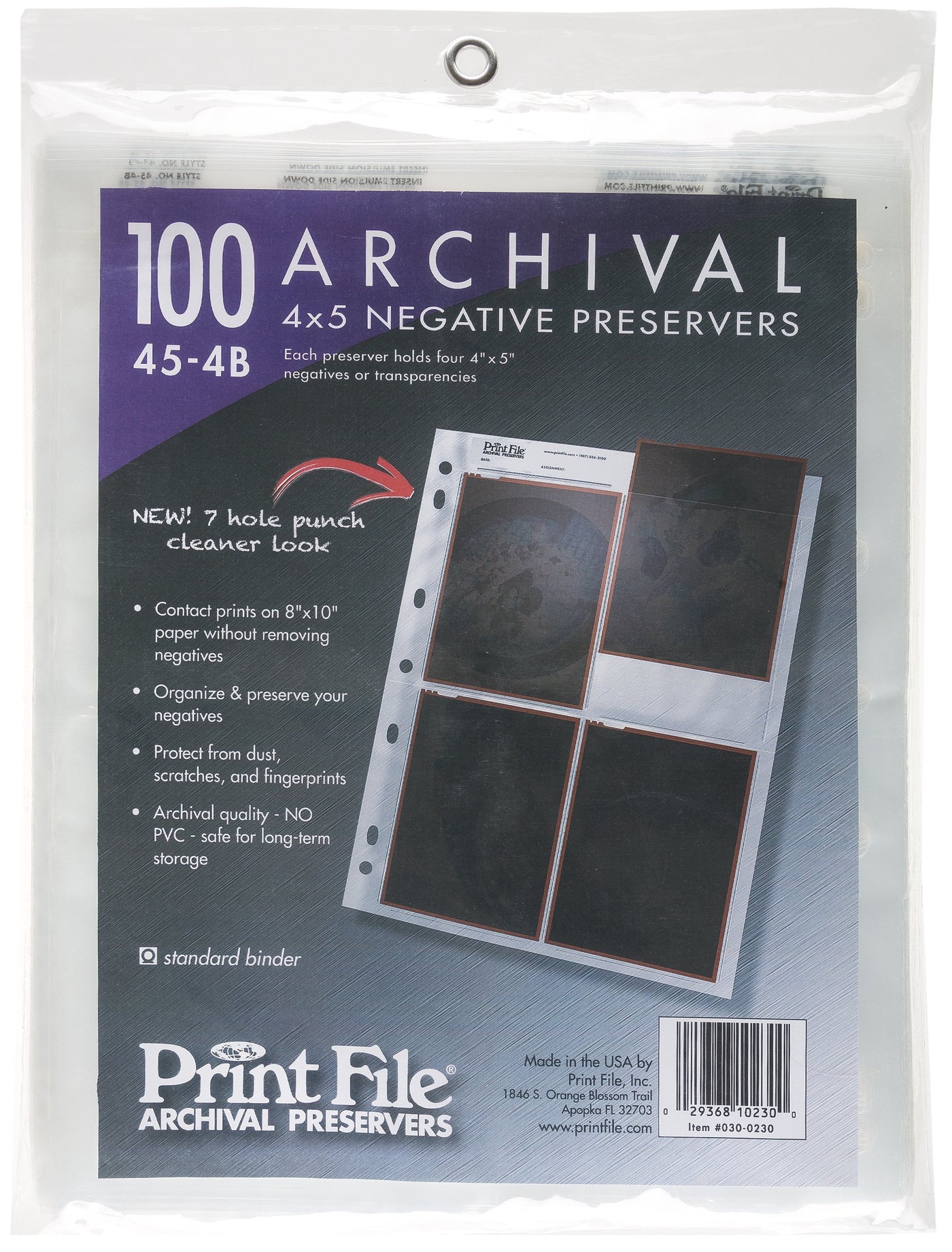 Q: What size negatives can the Printfile 454B100 hold?A: The Printfile 454B100 is designed to hold four 4" x 5" negatives or transparencies, making it perfect for organizing and protecting your photographic materials.