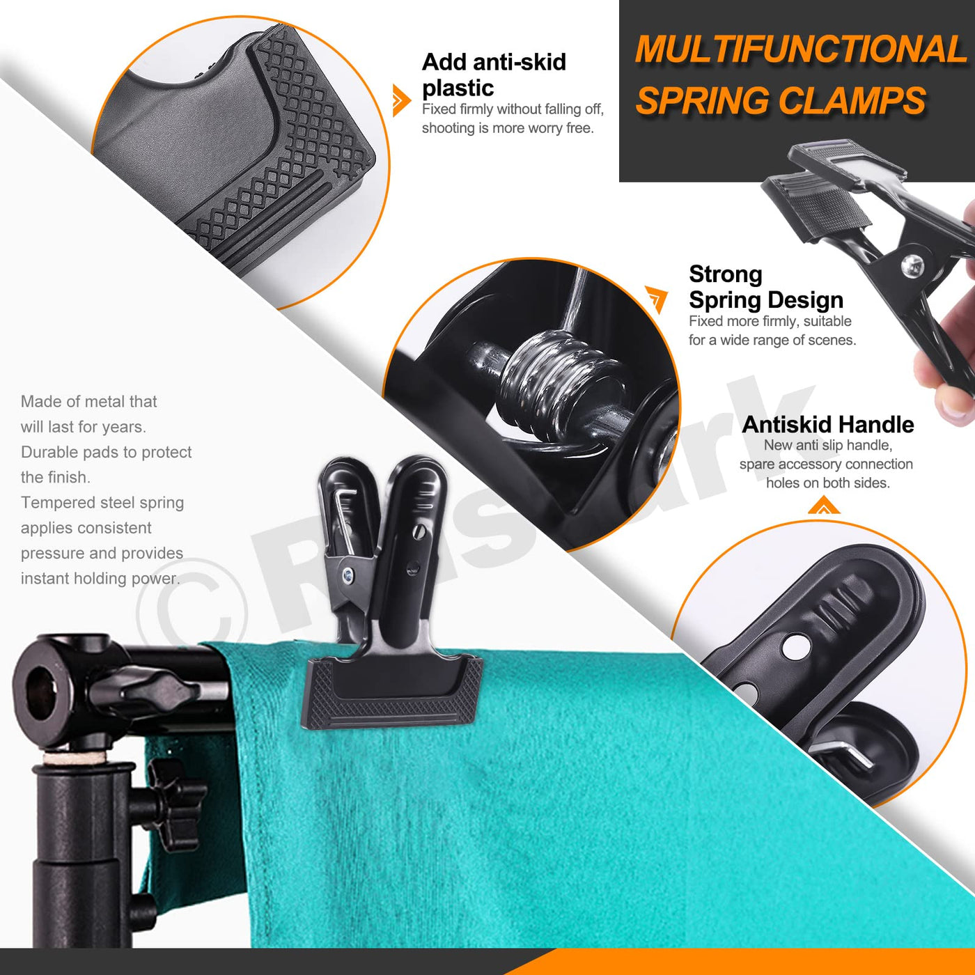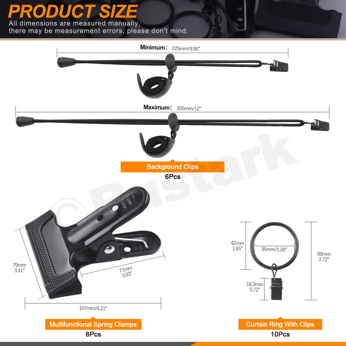 ? Rustark Backdrop Heavy Duty Spring Clamps Elastic Photo Clips Holder Clips Assortment Kit With Curtain Clips Backdrop Rings Metal Backdrop Clips Clamps For Photography Video Studio Photo Backdrop ??Specification?? ?Size : Please See The 2Nd Picture For More Size Information. ?Material: Steel Material ?Color: Black ??The Advantages Of This Kit?? ?Reliable & Good Quality - Made Of Strong Steel Material That Is Able To Withstand Various Weather Conditions. ?Great Combination- Come In 6 Heavy Duty Backdrop Clamps + 6 Elastic Backdrop Clips Holders + 10 Curtain Rings With Clips In 1 Kit, Which Will Fill Your Various Needs. ?Practical Design- Featuring Non-Slip Rubber Tips Keeps The Green Screens Flat And Stable, While Provides Great Holding Power. ??Package Includes?? 6 X Heavy Duty Backdrop Clamps 6 X Elastic Backdrop Clips Holders 10 X Curtain Rings With Clips Total: 22Pcs ?Warm Tips: -If You Come Across Any Questions, Please Feel Free To Come To Us. We Will Solve It For You As Soon As Possible!